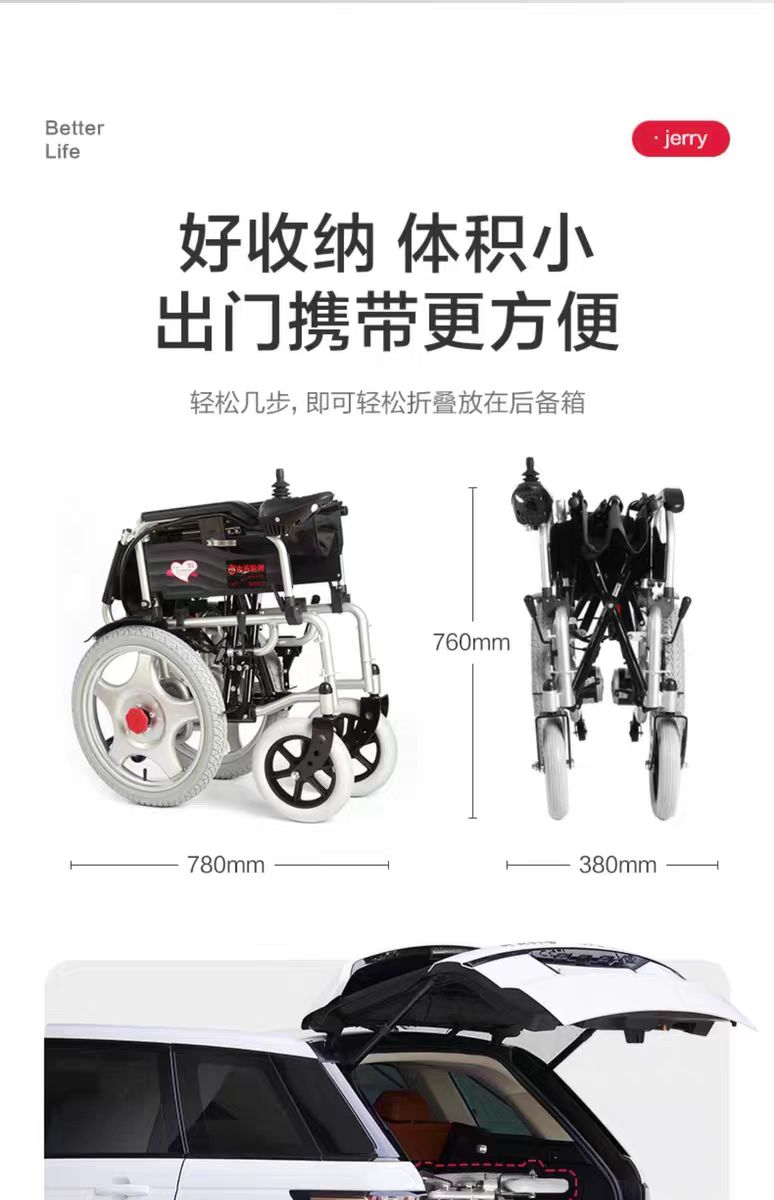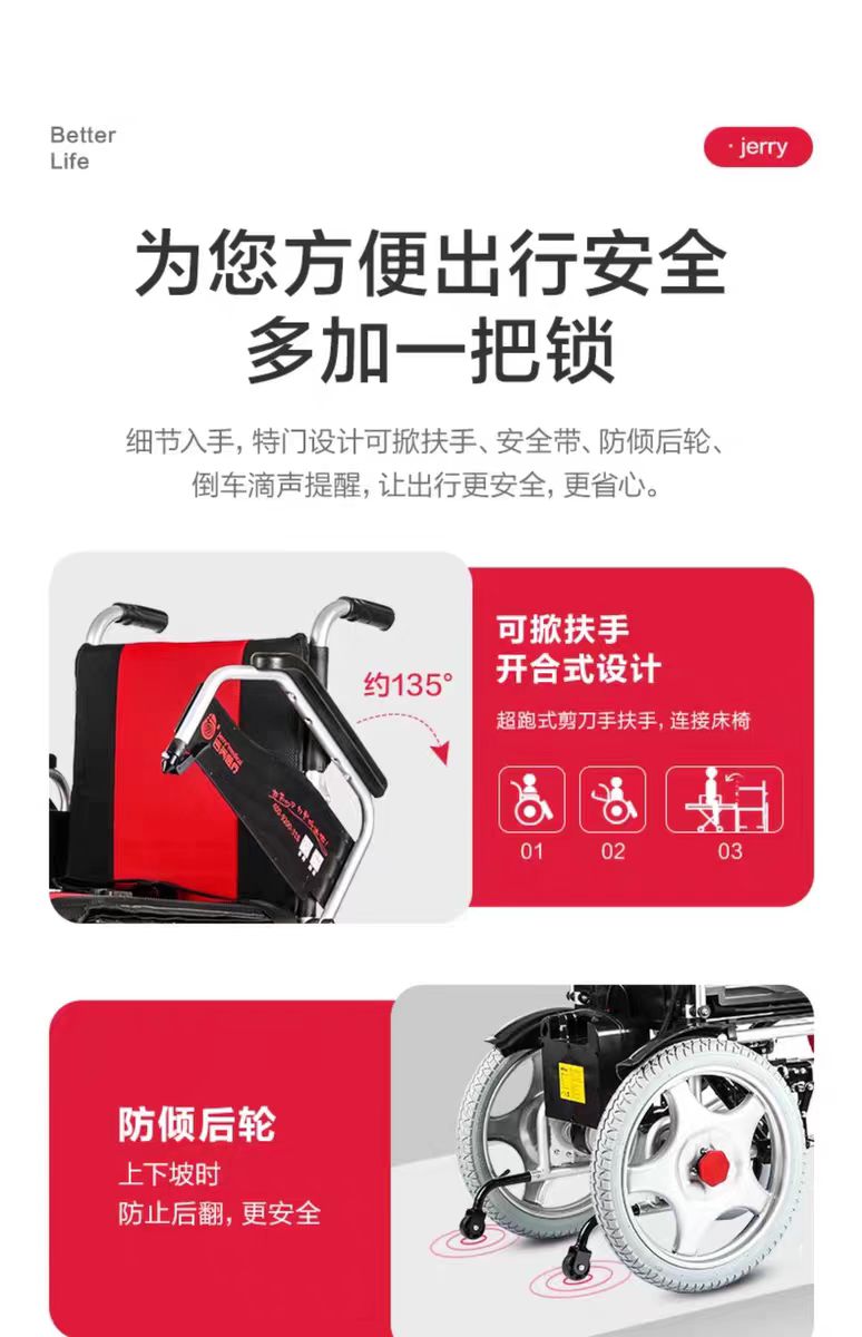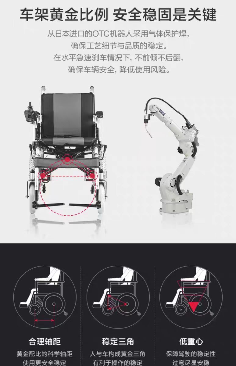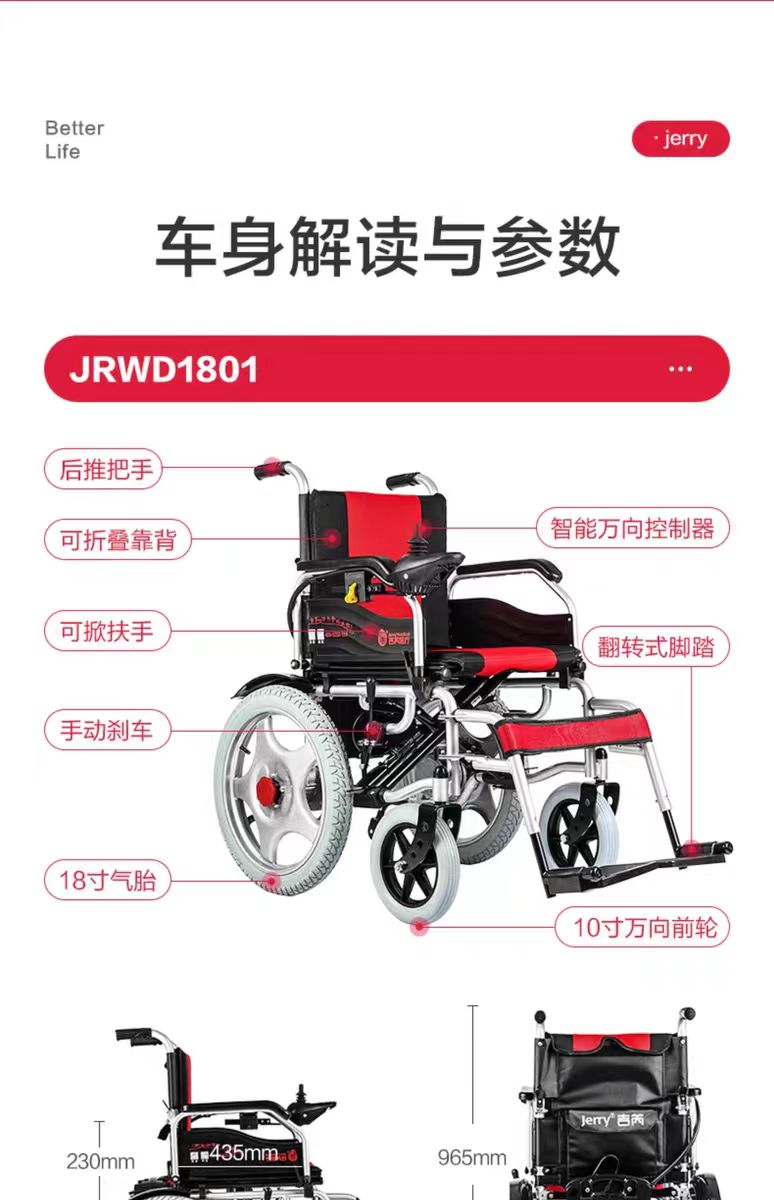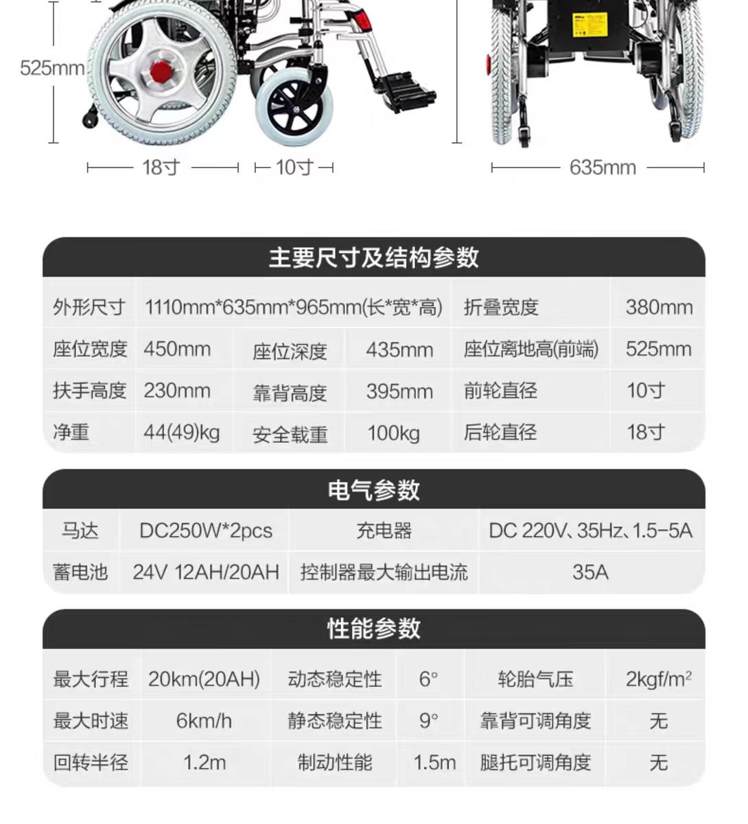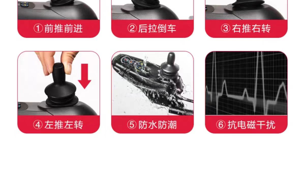 3)前轮为直径10寸免充气轮胎,后轮为直径18寸减震充气轮胎,后轮装配手扶圈。 4) 座背垫为600D透气海绵坐垫,配置安全带 5) 配置防后倾倒装置 6)后轮双电机驱动,二级减速直齿轮电机,双离合,行驶稳定性高,电机:250W*2pcs; 7)电池悬挂轮椅座位下方中间,配置12安铅酸电池。 8) 采用摇杆式控制器,具有360度智能方向控制,控制器杆可以前后调节,可变换时速:1-6km/h,可显示速度调节和电量。可单手操控,具备故障报警功能; 9)可折叠车架,可拆卸跨脚,脚踏板高度可调、可掀扶手,