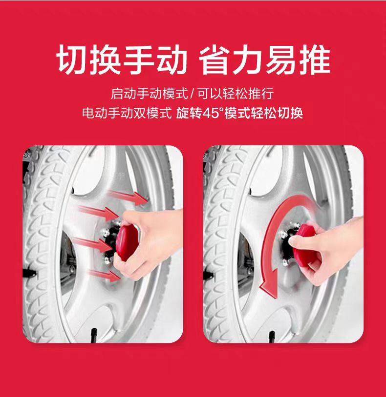 1)具有手动/电动两种模式操作,手动模式打带离合,后轮运转自如,