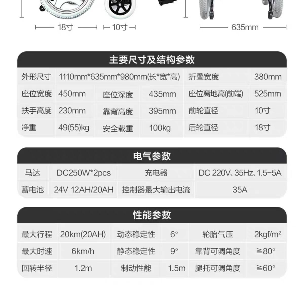 | 送货时效 | 7-15个工作日 | 产品参数 | 续航力:20KM 净重(kg):49 前轮尺(inch):10 最高时速:6KM/h 整车长(mm):1100 坐高(mm):530 车架、颜色:碳钢、闪光银 整车宽度(mm):635 整车高(mm):980 电池:24V 20AH锂电电池 折后宽度(mm):560 坐深(mm):435 控制器:智能万向控制器 座宽(mm):450 靠背高(mm):400 电机:250W*2pcs,带电磁刹车 后轮尺寸(inch):18 载重(kg) :100 |