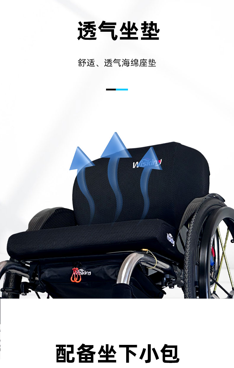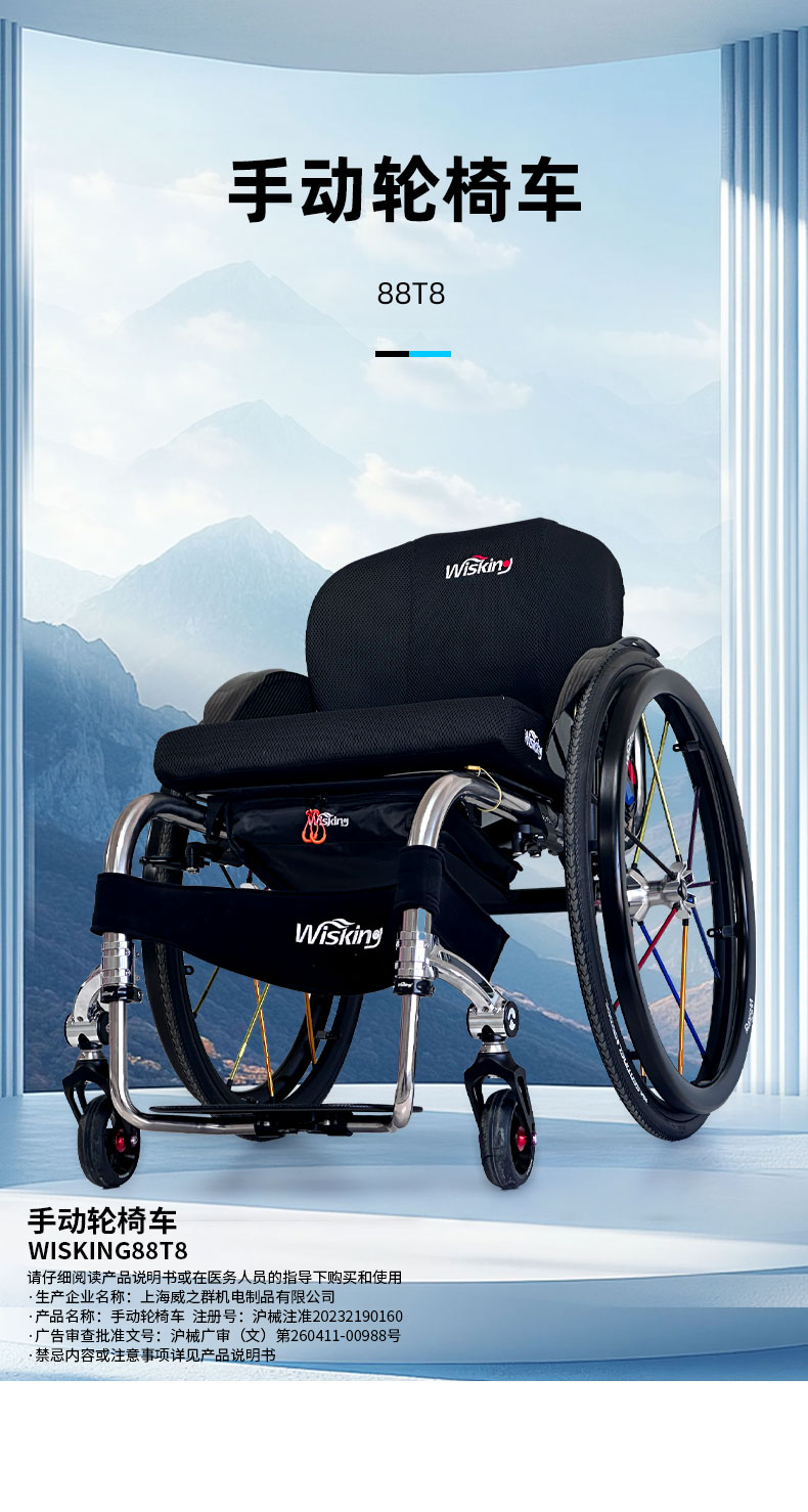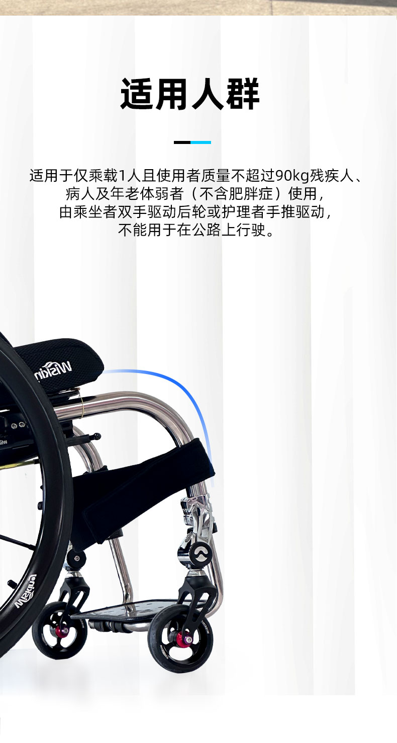 | 产品材质 | 钛合金车架,碳纤维边板,轻巧灵活。后轮可快拆,靠背可折叠。 | 使用说明 | 威之群运动式生活轮椅是根据脊髓损伤者的受伤位置、身高、体重,坐宽、坐深、小腿长度来量身定制的轮椅,人性化、个性化的解决了不同伤友对轮椅的不同需求问题。 |