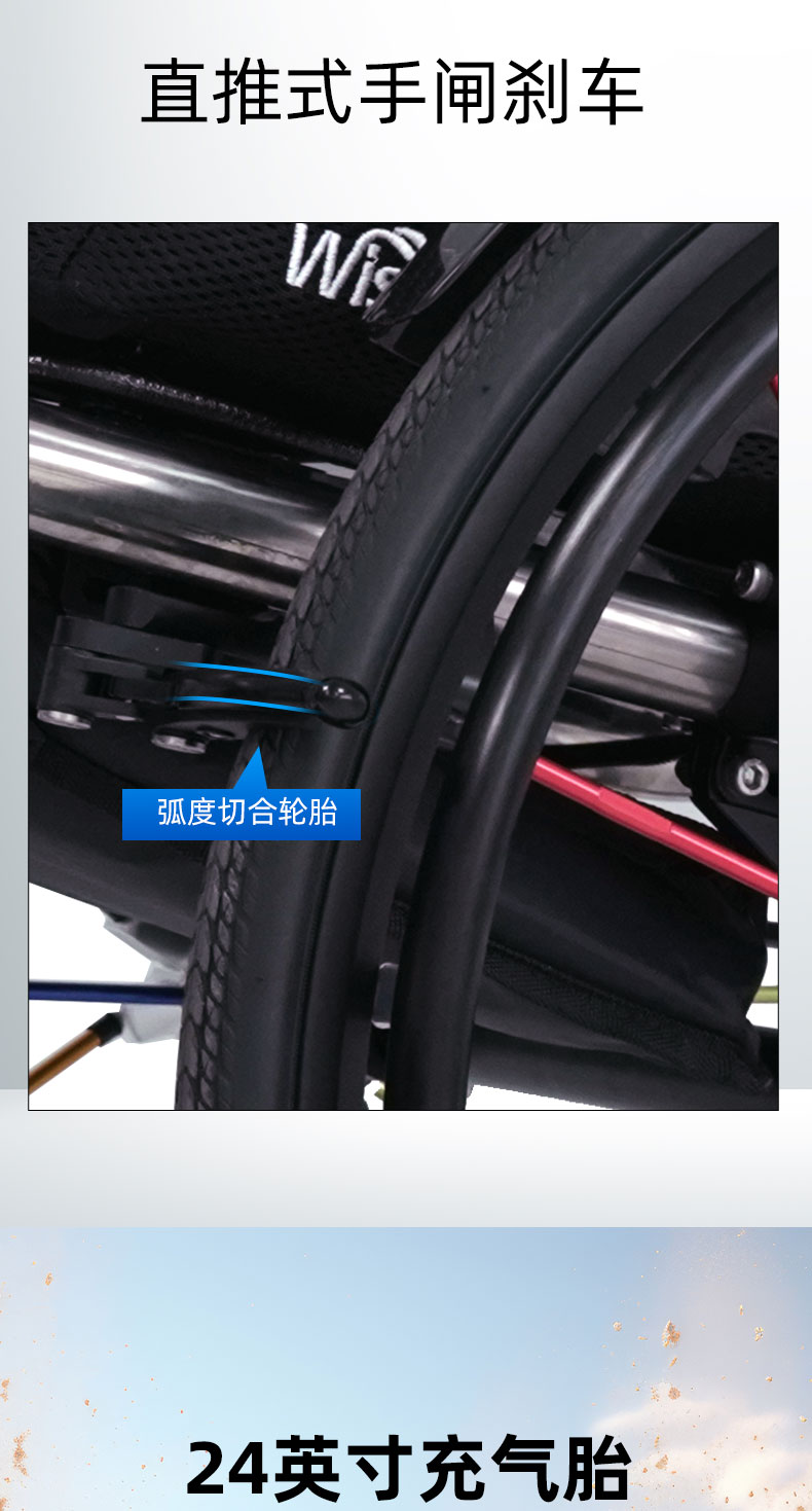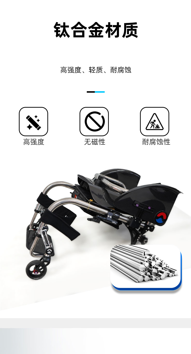 | 送货时效 | 15个工作日 | 产品参数 | 钛合金车架,碳纤维边板,前轮为4英寸,后轮为24英寸,后轮可快拆,靠背可折叠。前小轮、花鼓等颜色可选。坐宽、坐深、小腿长度均为定制尺寸。 |