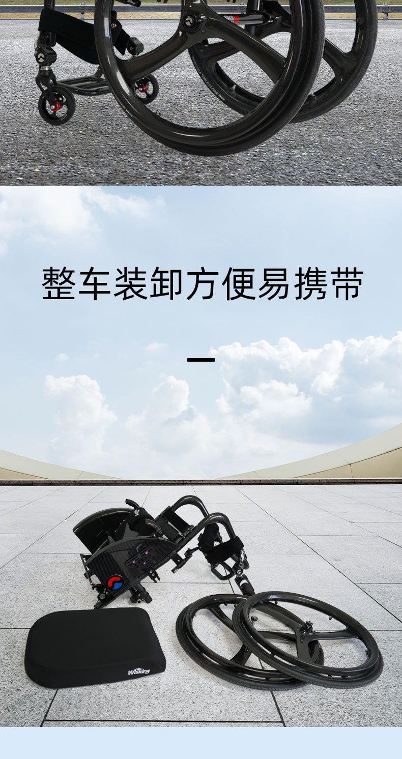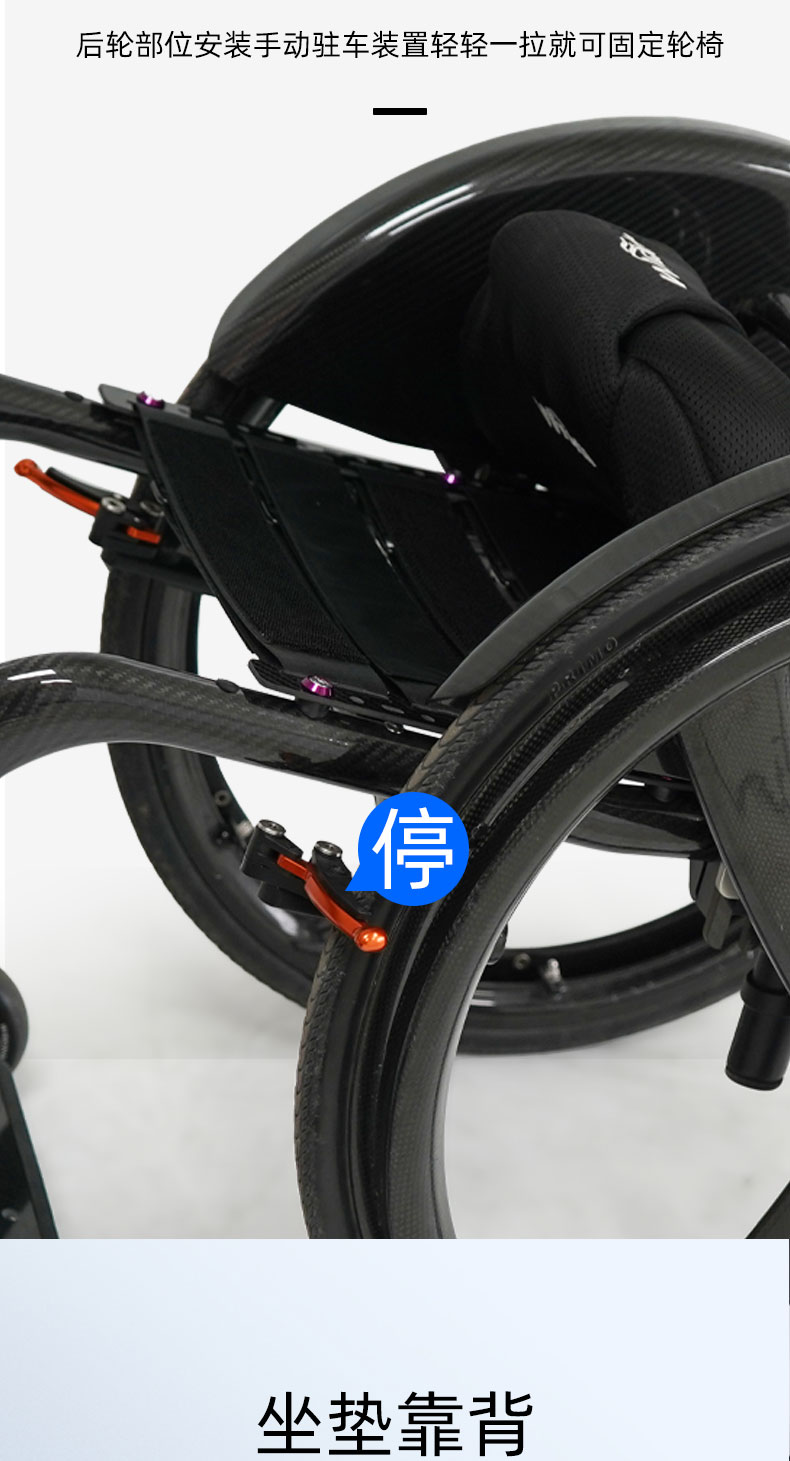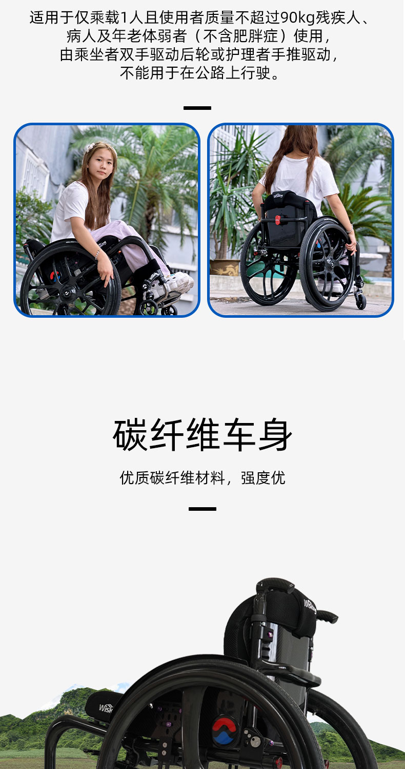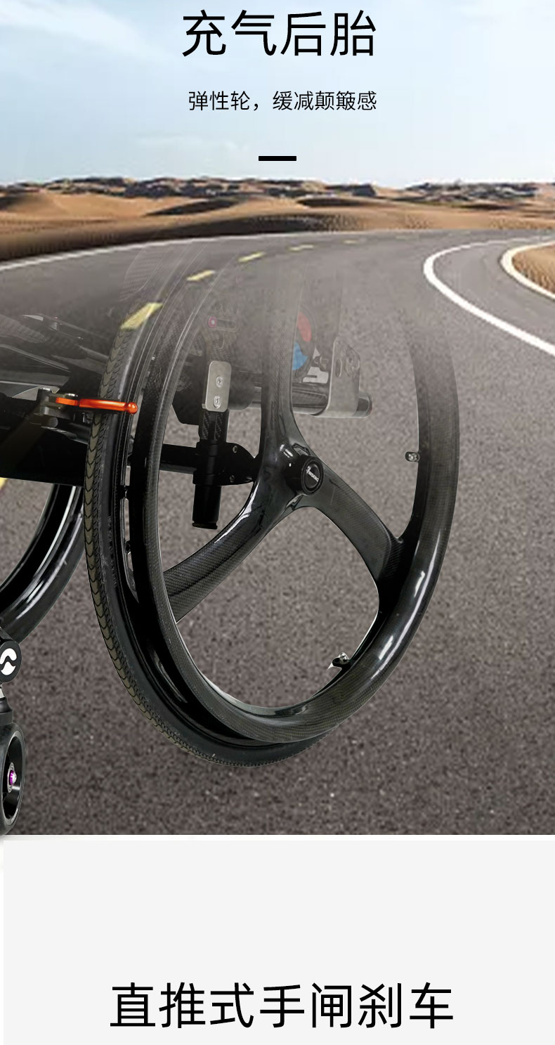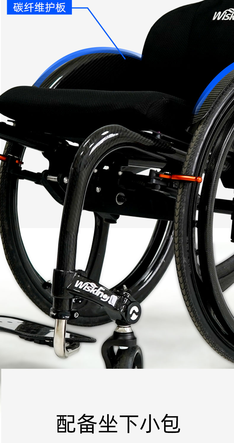 | 送货时效 | 20个工作日 | 产品参数 | 碳纤维车架,碳纤维边板,整车重量为14公斤,非常轻巧。前轮为4英寸,后轮为24英寸,后轮可快拆,靠背可折叠。前小轮、花鼓等颜色可选。坐宽、坐深、小腿长度均为定制尺寸。 |
