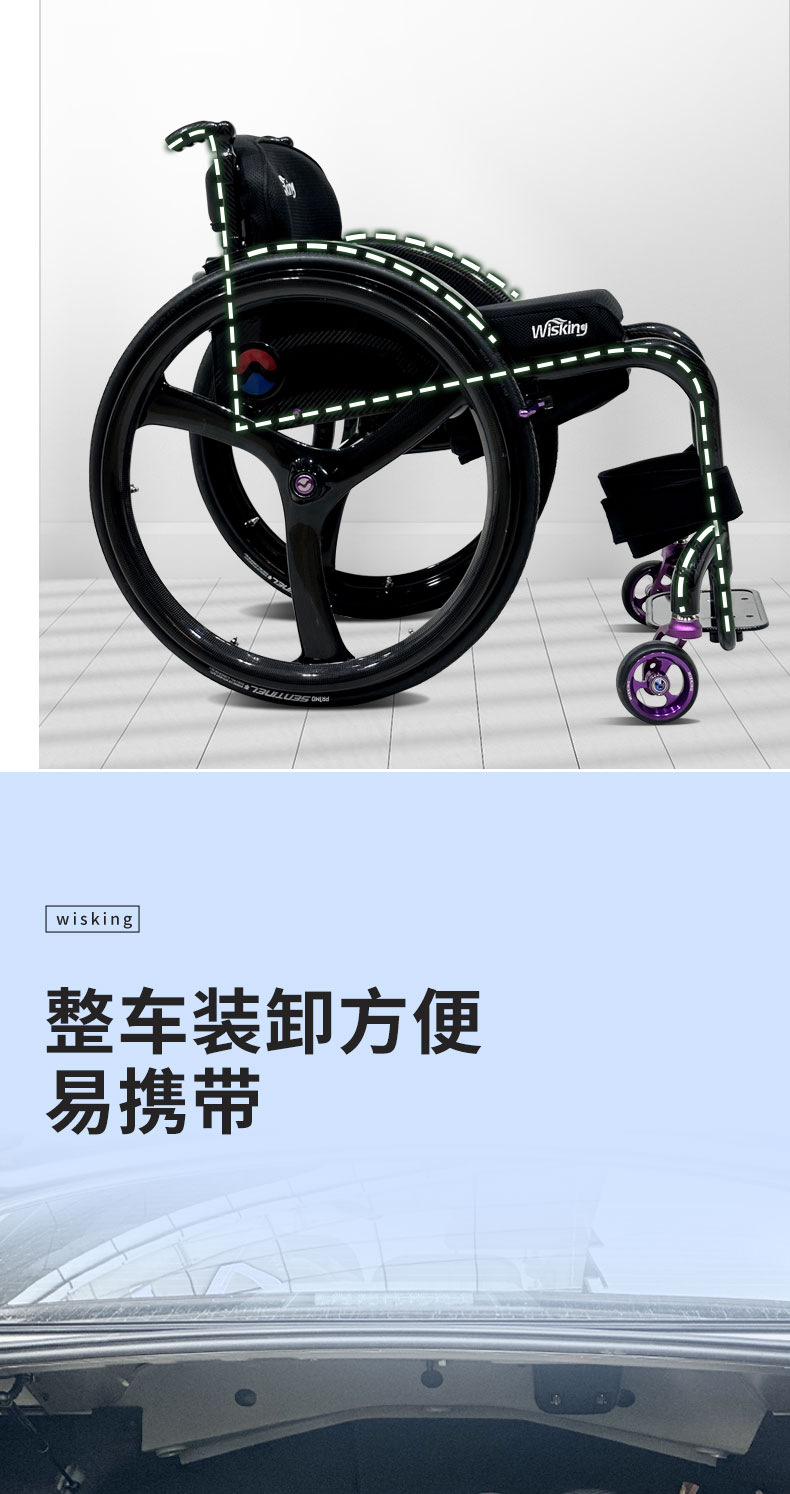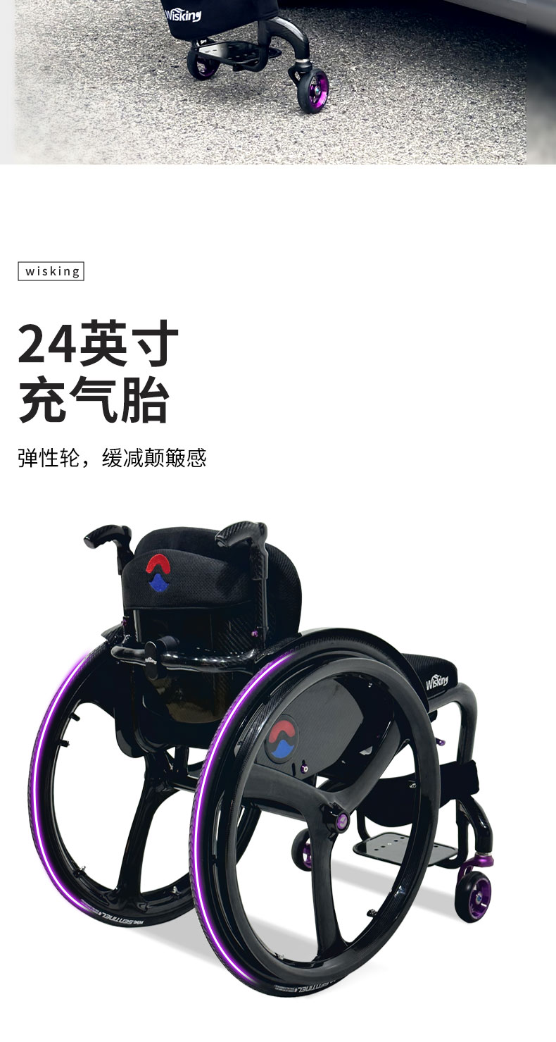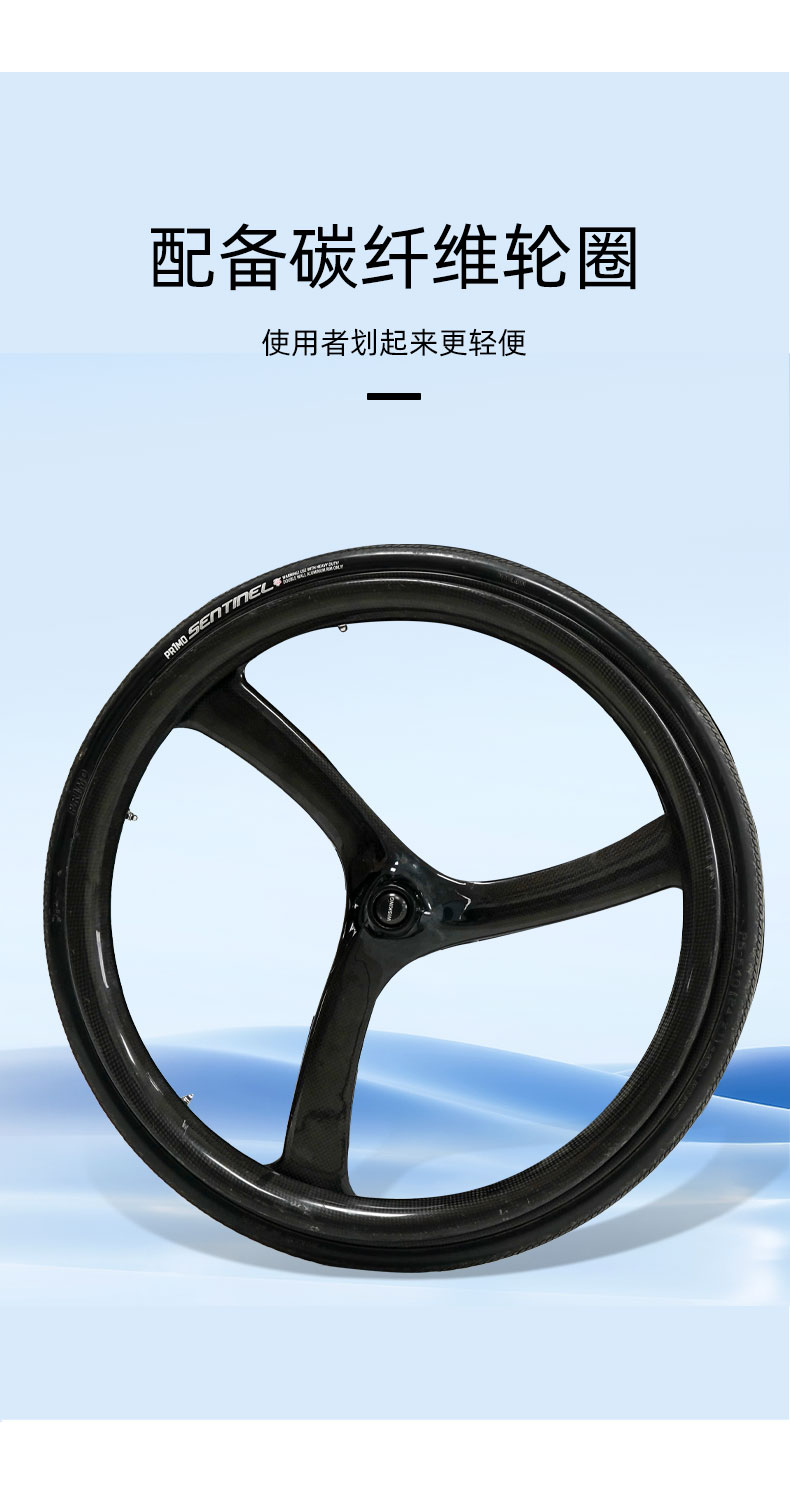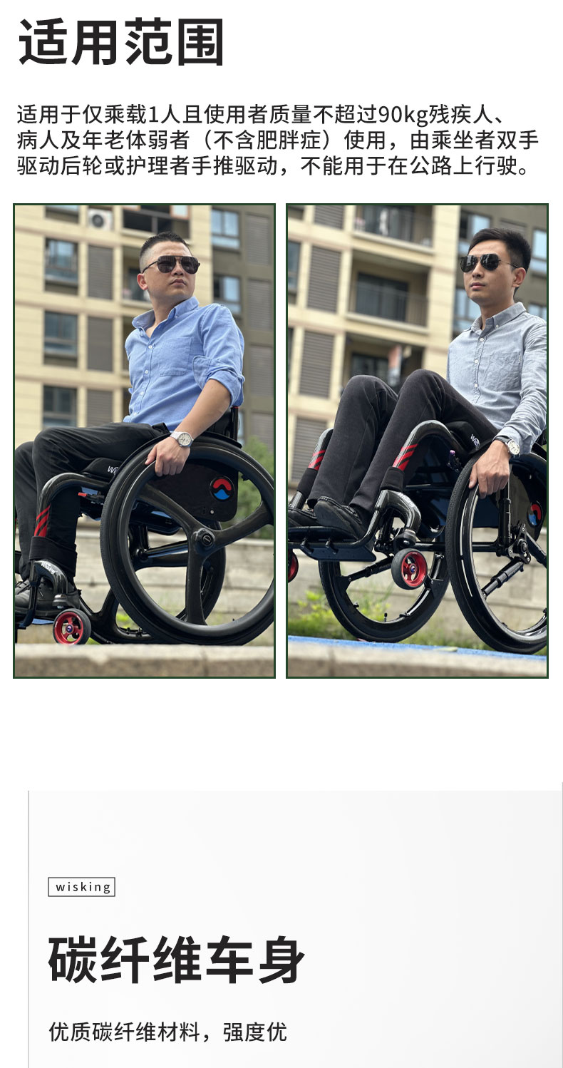 | 送货时效 | 20个工作日 | 产品参数 | 碳纤维车架,碳纤维边板,整车重量为10公斤左右,非常轻巧。前轮为4英寸,后轮为24英寸,后轮可快拆。前小轮、花鼓等颜色可选。坐宽、坐深、小腿长度均为定制尺寸。 |