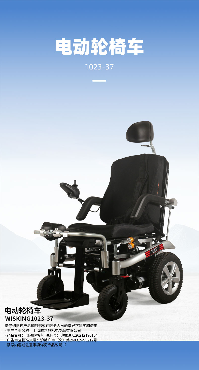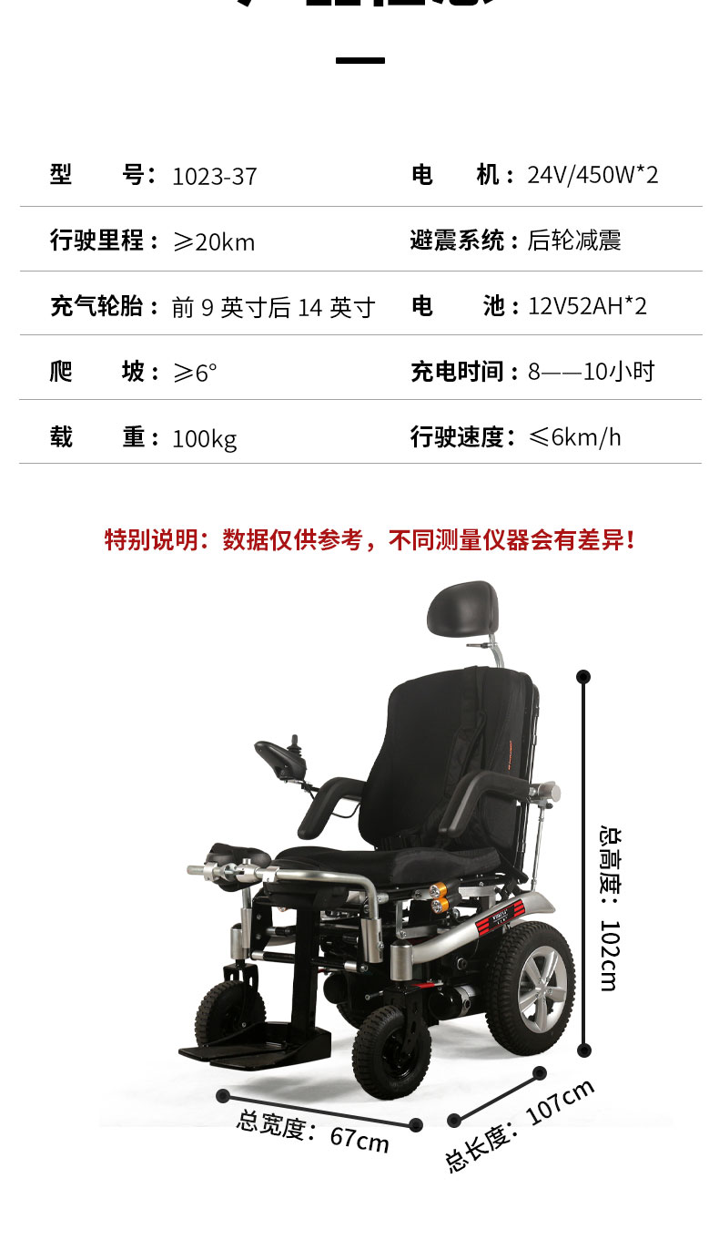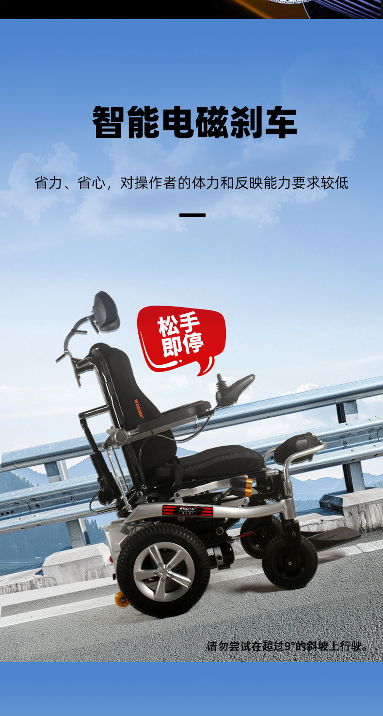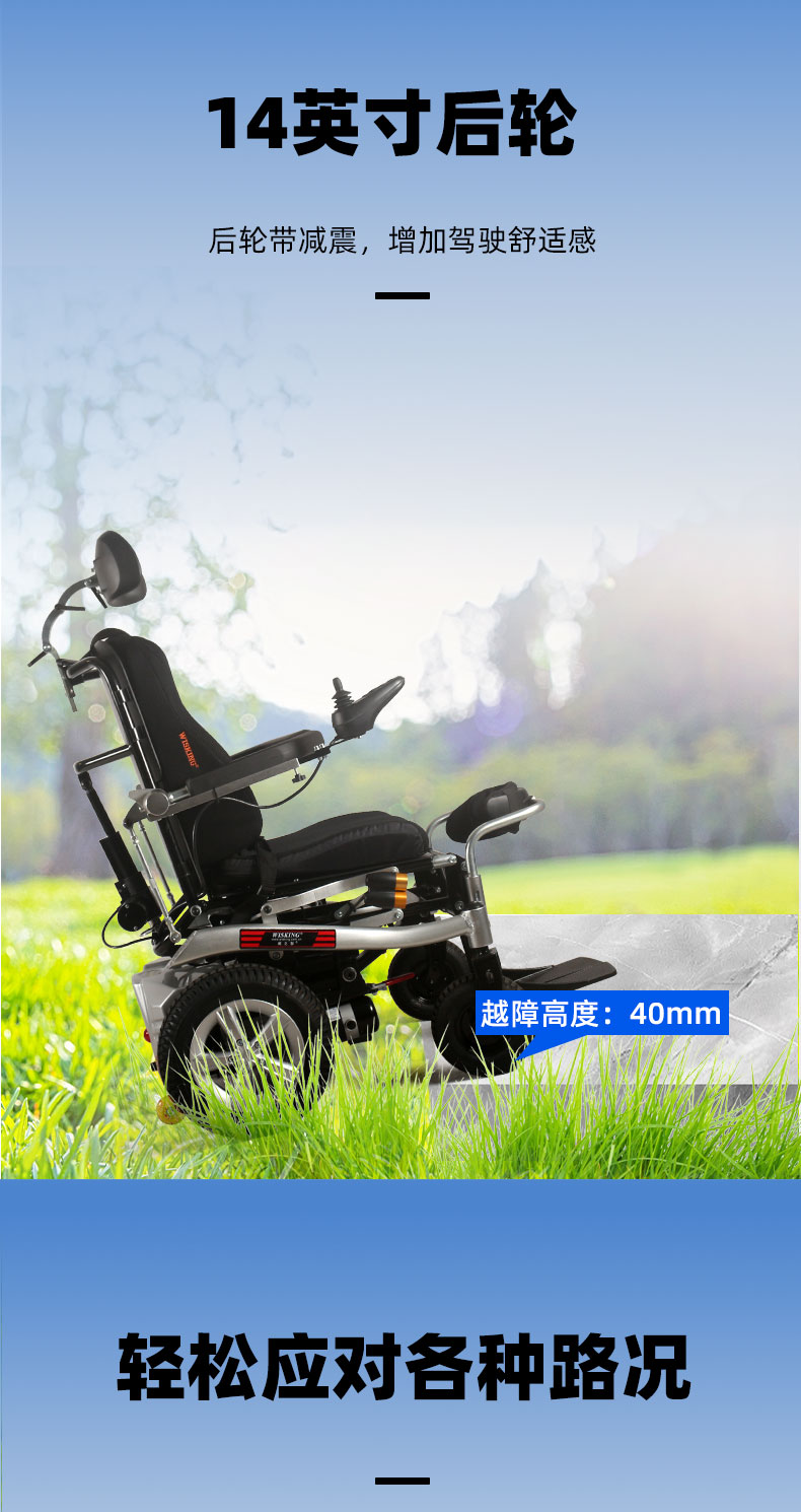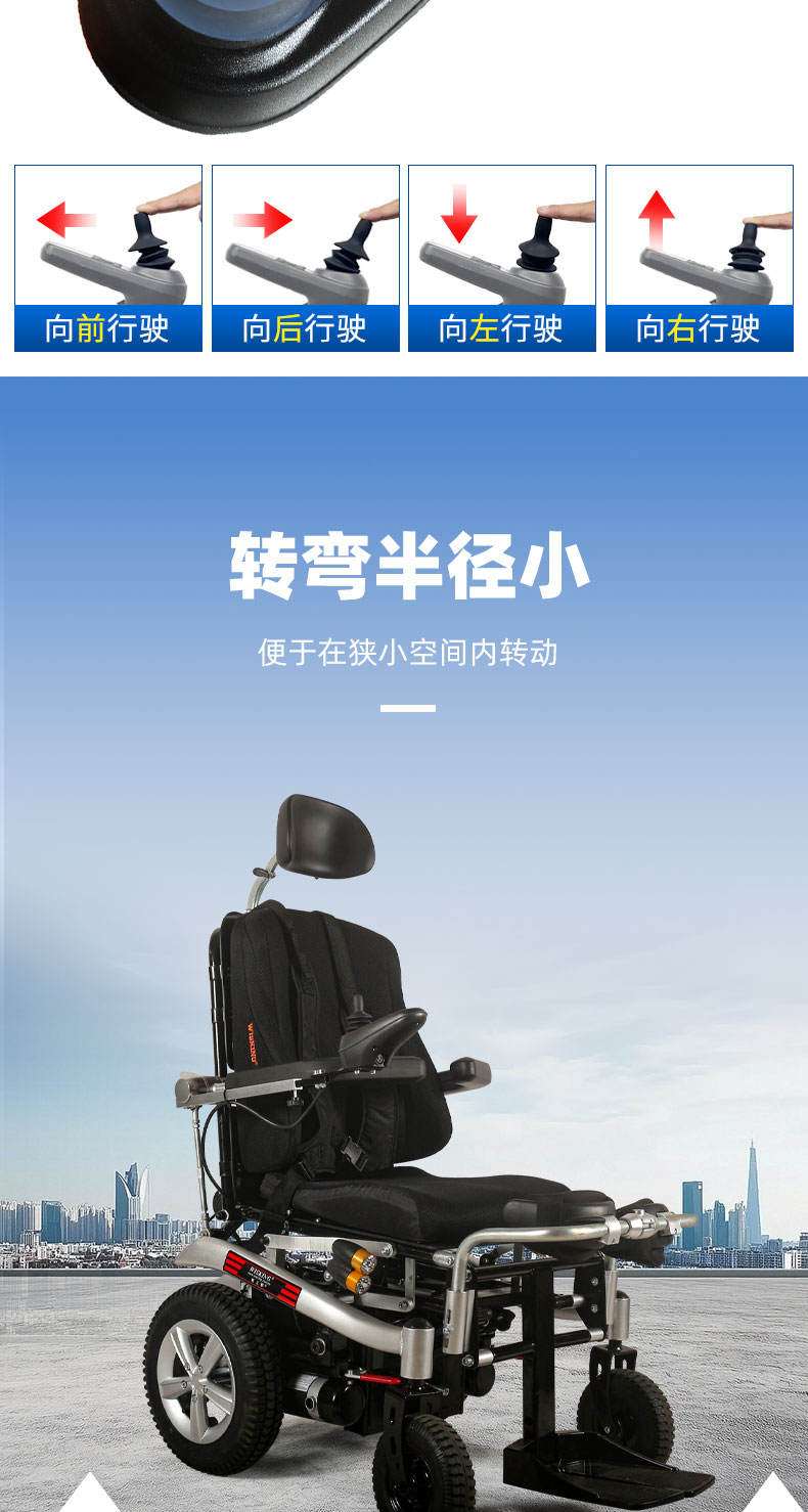| 产品材质 | 整车大部分材质采用高性能钢材为主 座靠垫采用高性能海绵加透气网布垫包裹设计 | 使用说明 | 1.上坡不后溜,下坡不俯冲。 2.电动后躺、站立等功能必须在轮椅静止(无行驶)状态下使用,不可以在功能模式下采用电动或手推模式移动轮椅。 3.操作乘移电动轮椅前,必须确认安全带完好有效并正确系好,否则可能导致人身伤害。 |