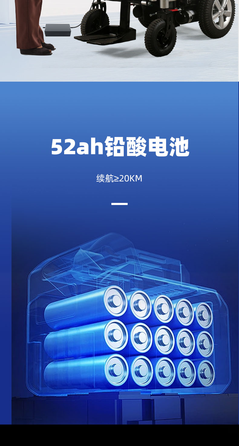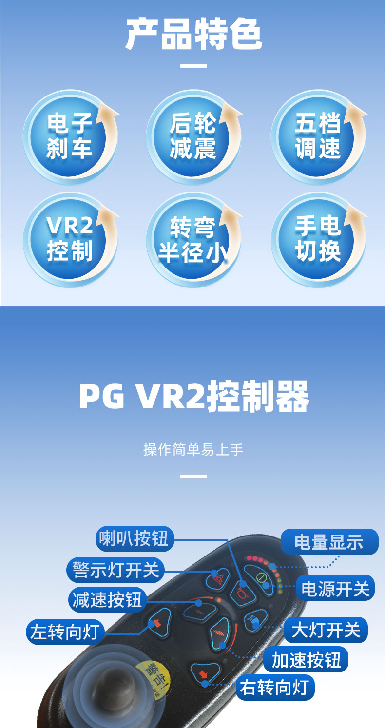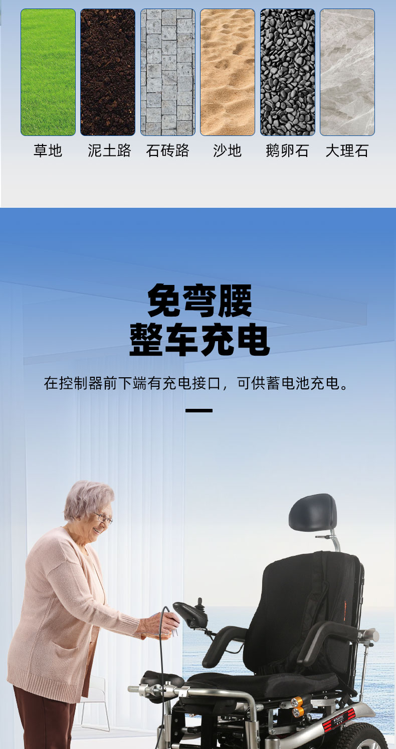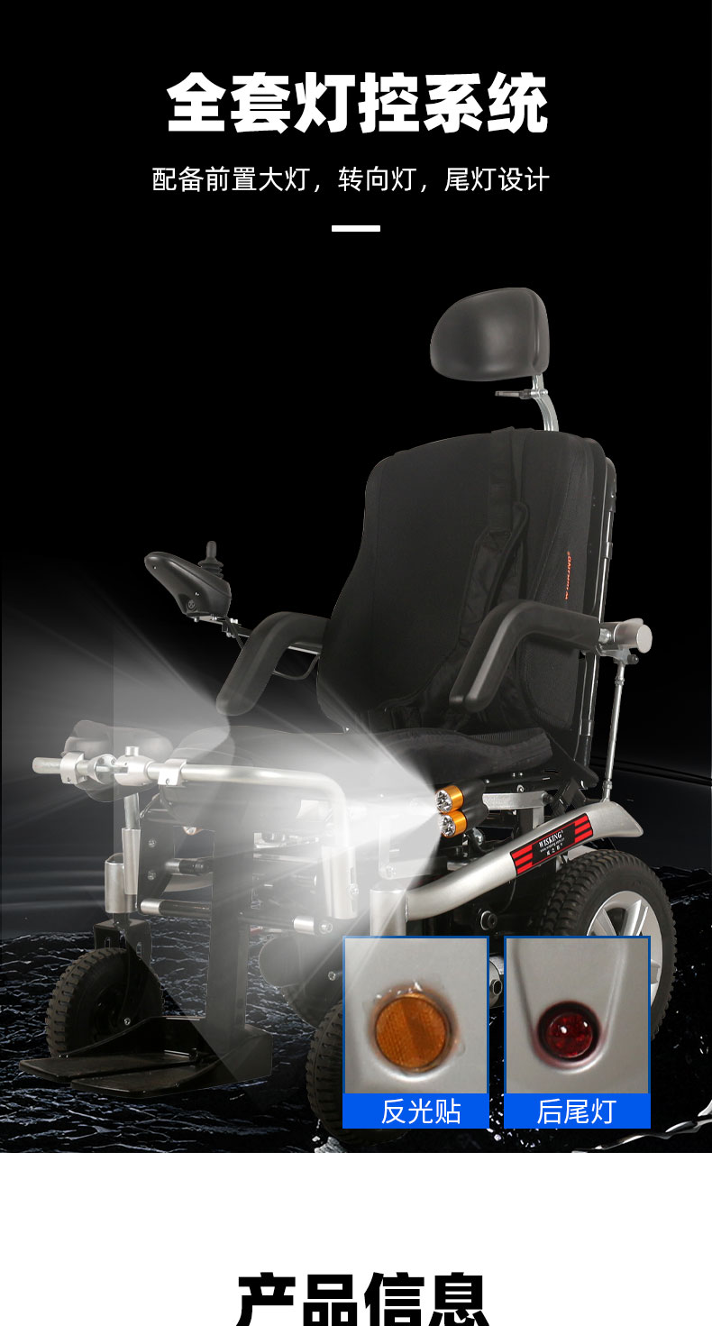 | 产品材质 | 整车大部分材质采用高性能钢材为主 座靠垫采用高性能海绵加透气网布垫包裹设计 | 使用说明 | 1.上坡不后溜,下坡不俯冲。 2.电动后躺、站立等功能必须在轮椅静止(无行驶)状态下使用,不可以在功能模式下采用电动或手推模式移动轮椅。 3.操作乘移电动轮椅前,必须确认安全带完好有效并正确系好,否则可能导致人身伤害。 |