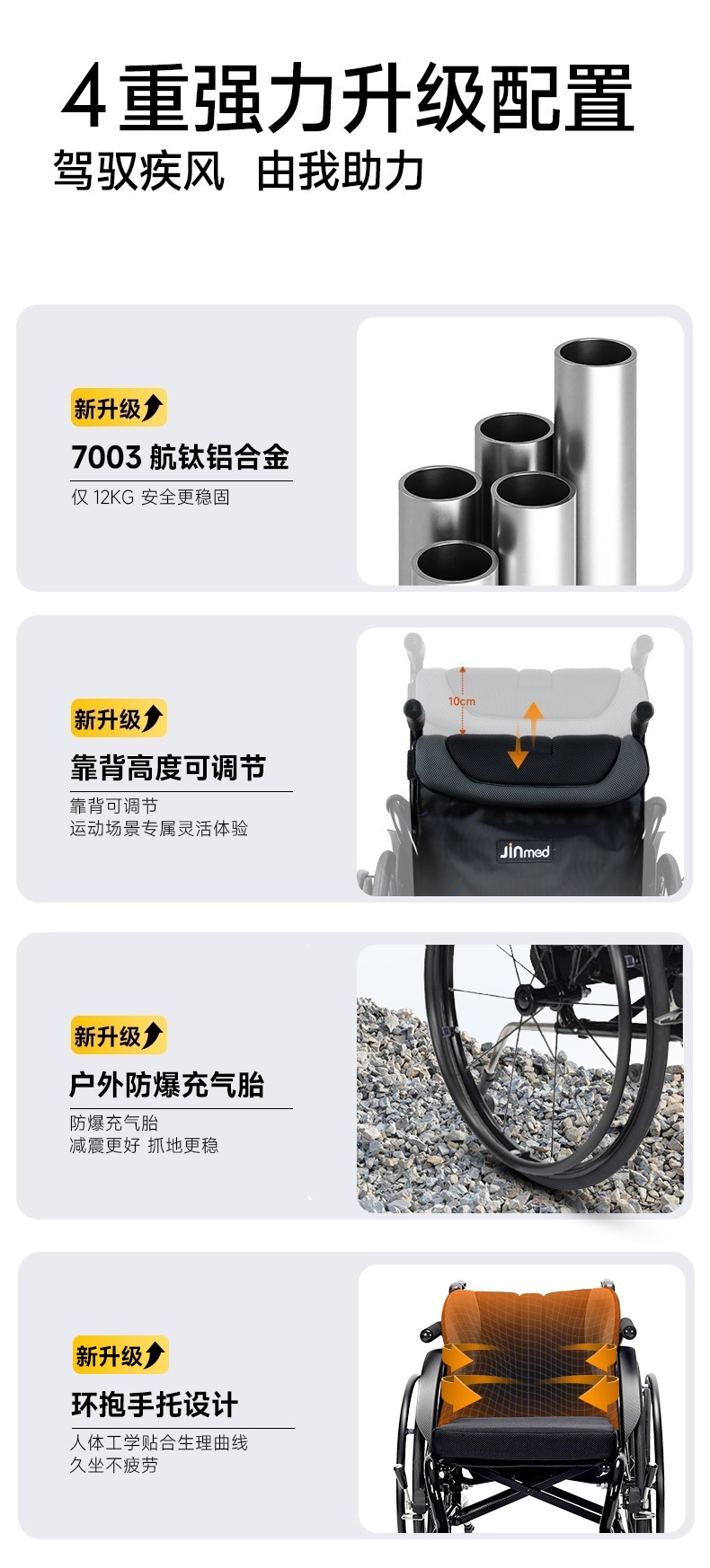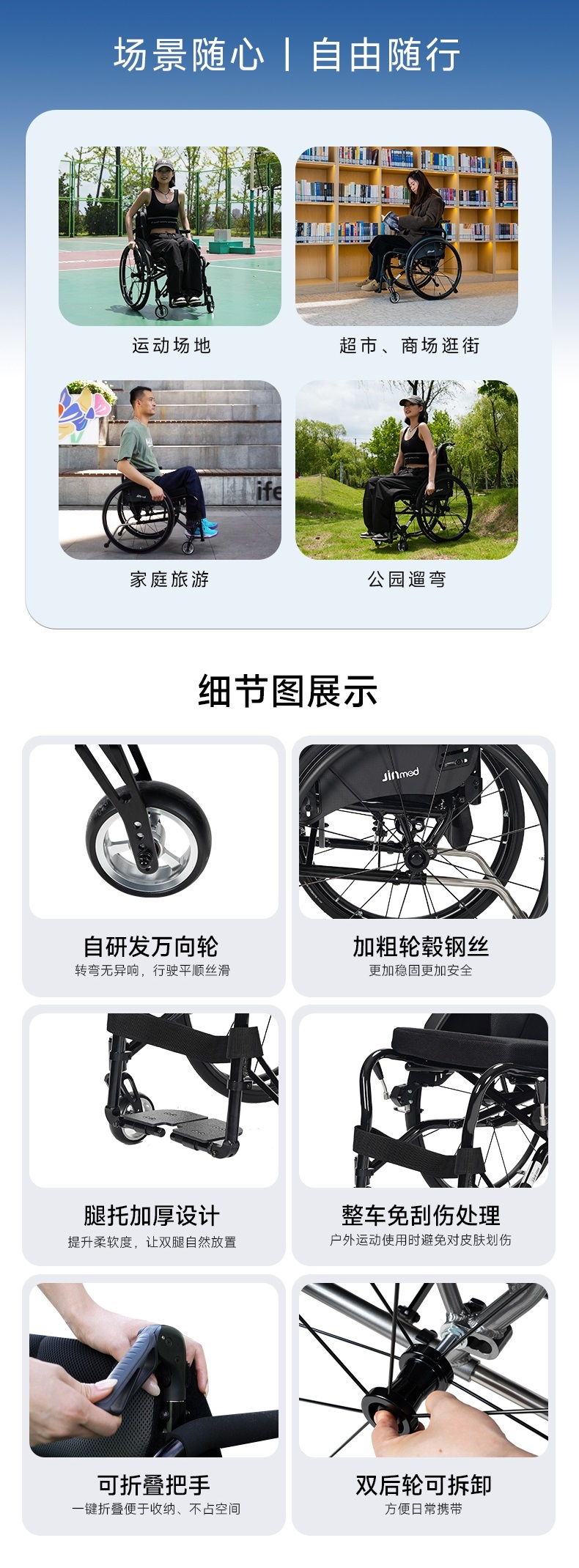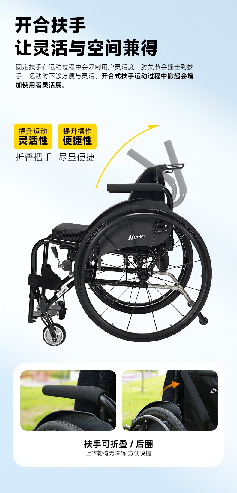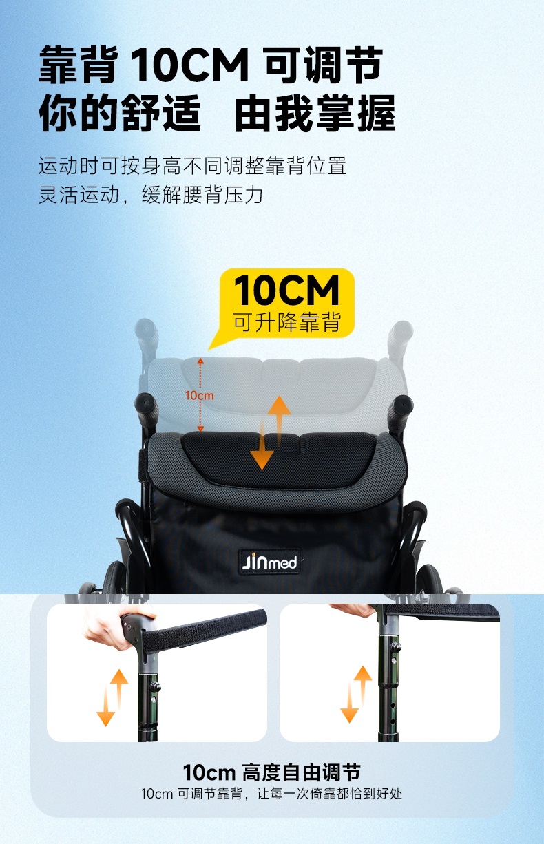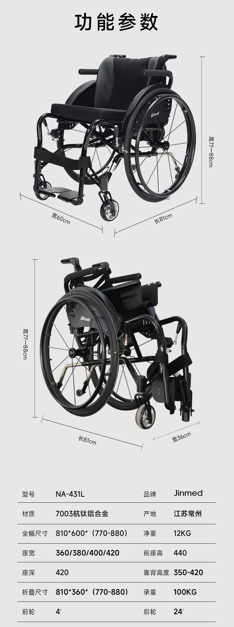 | 送货时效 | 7日历日 | 产品参数 | (单位:cm,座宽38cm时)展开尺寸:长81宽58高77-88;折叠尺寸:长81宽34高77-88;座宽:36/38/40/42;座高:44;背高:35-42;座深:42;扶手高:28-32;前轮:4寸;后轮:24寸气胎;净重:12kg;载重:100kg。 |