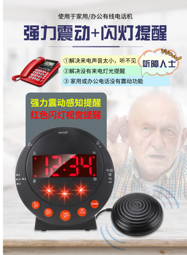 | 送货时效 | 预约后10个工作日内 | 产品参数 | 产品颜色:黑色 产品重量:时钟:215g,振动器:147.5g 包装重量:570g 产品尺寸:时钟:14.5*6.5*15cm 振动器:10.5*3.9*10.5cm 包装尺寸:14.5*10.5*12.5cm 外箱尺寸:54*31*63cm |