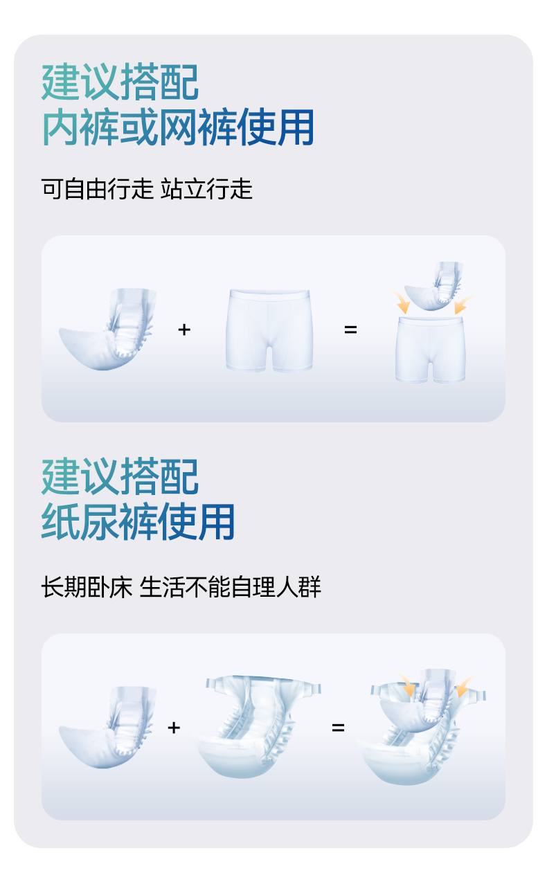 | 产品材质 | 由非织造布和塑料膜复合或缝制而成,非无菌提供,一次性使用 | 使用说明 | 可搭配纸尿裤,有效防漏、保持清洁,可单独使用 |