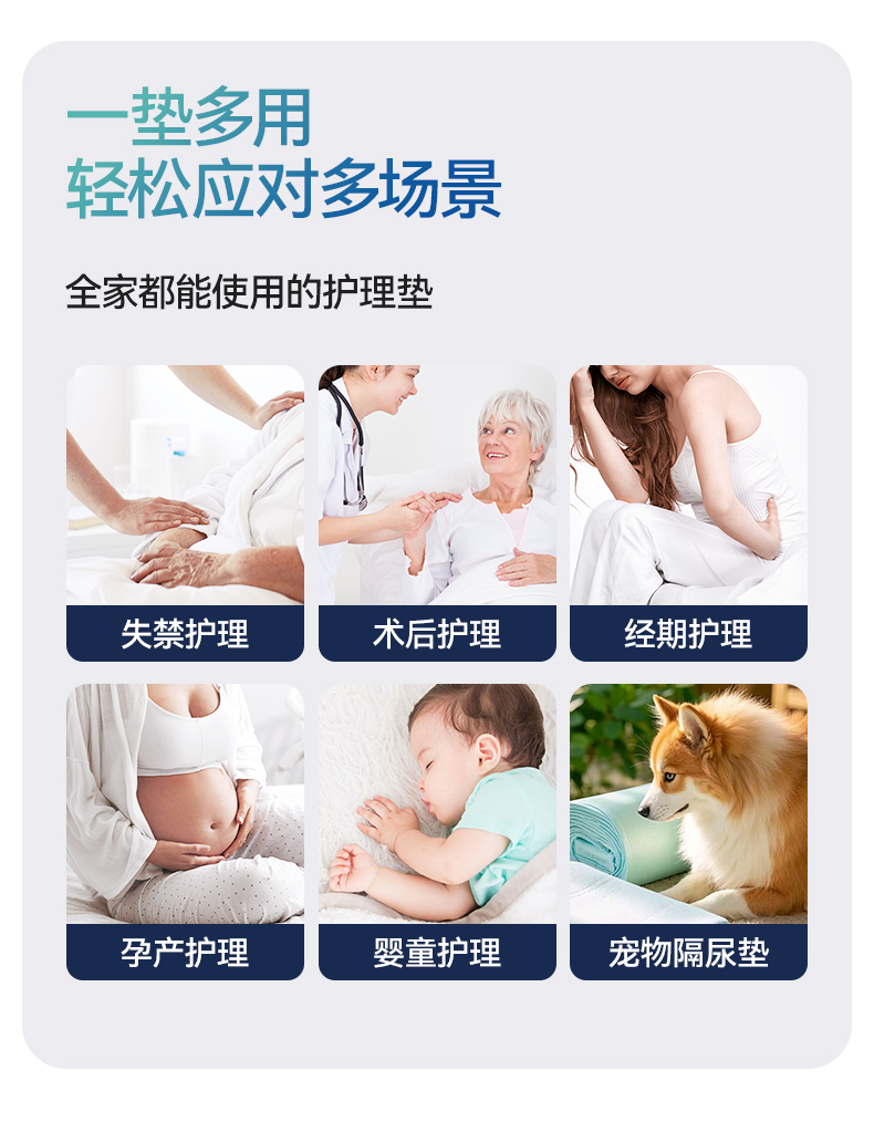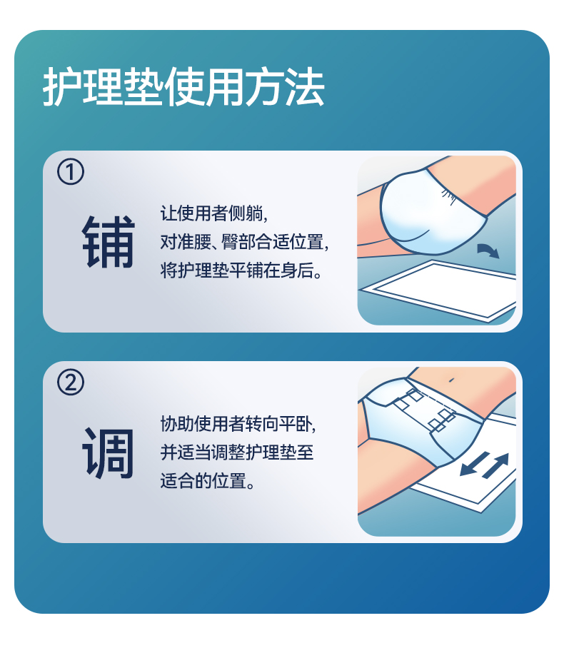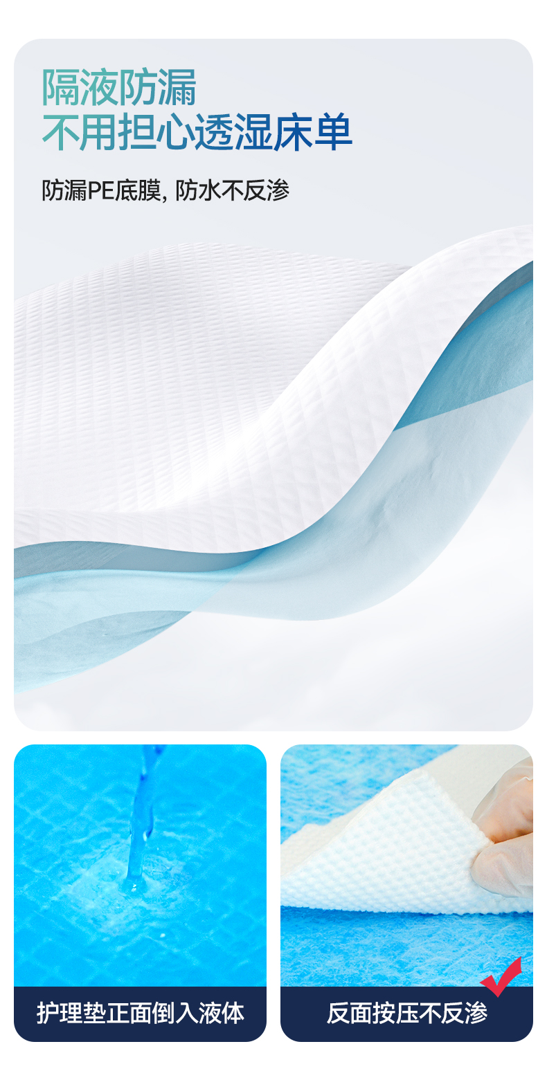 | 产品材质 | 由非织造布和塑料膜复合或缝制而成,非无菌提供,一次性使用 | 使用说明 | 1、可直接接触皮肤使用。 2、铺在椅子表面,有效防漏、保持清洁, 3、让使用者侧卧,将护理垫置于使用者身下,打开使用者较远的一边 4、协助使用者转向平卧,打开产品另一边,并适当调整上下左右位置,使护理垫位于 使用者身体正下方。 |