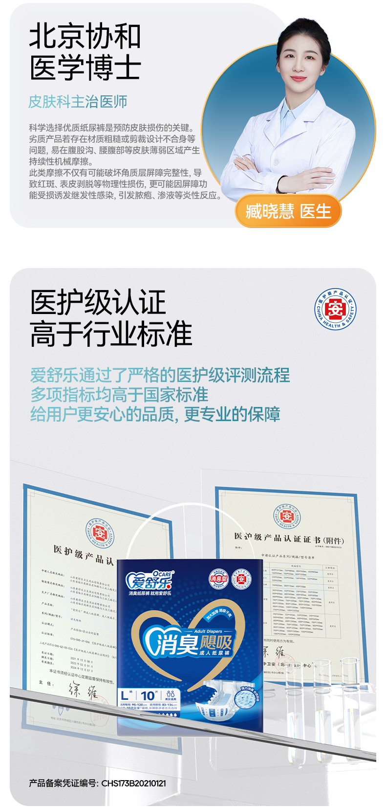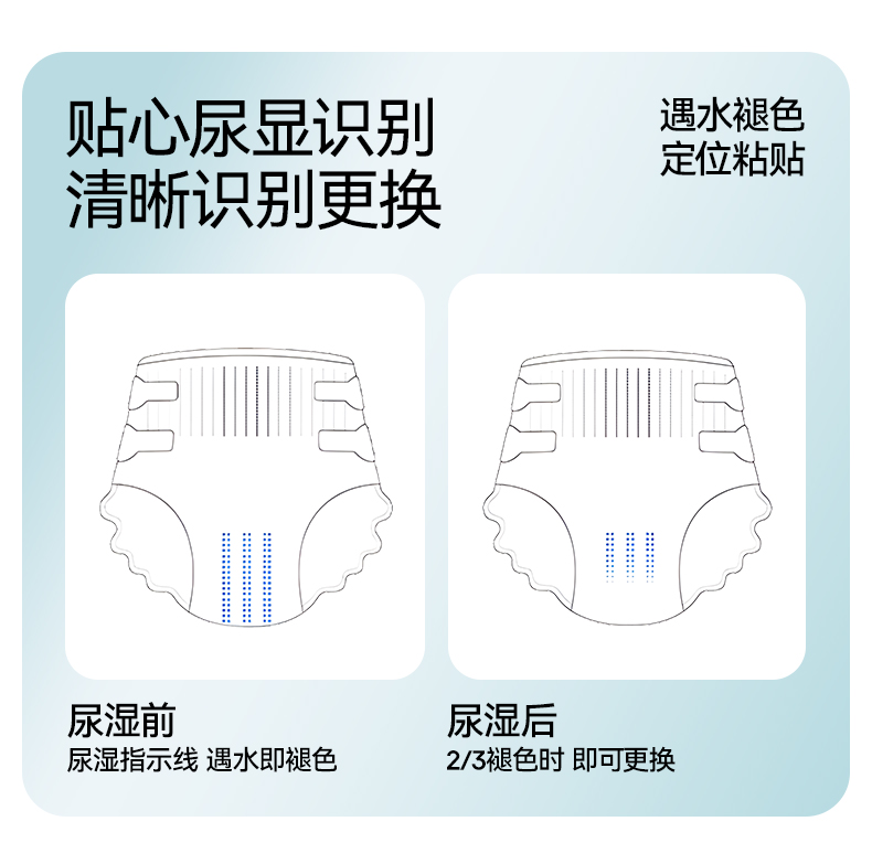 | 产品材质 | 由非织造布和塑料膜复合或缝制而成,非无菌提供,一次性使用 | 使用说明 | 1、使用者侧卧后:展开尿裤并使用腰贴端朝上:调整芯层在腰、臀之间的位置后:打 开另一端 2、协助使用者翻向另一侧:展开尿裤的另一端, 3.让使用者平躺或张开双腿,将有随意贴的尿裤部分拉到腹部位置,使前后两端对正。胶贴尿裤贴合在身体上,然后将两侧弹性隔边拉平,防止漏液外露 |