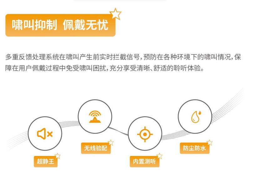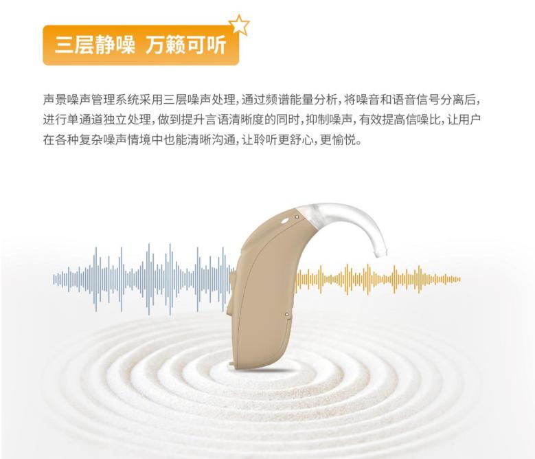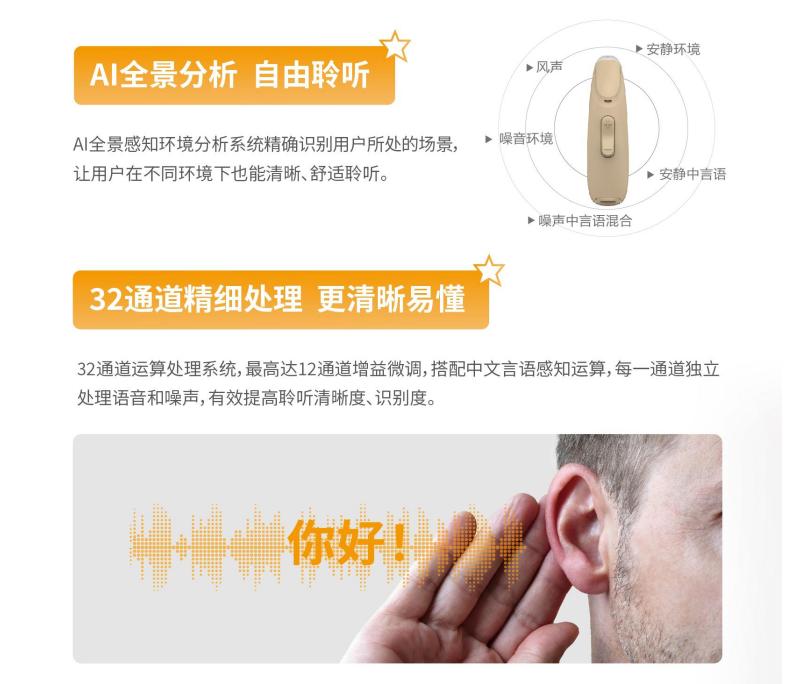 | 送货时效 | 接到订单后4个工作日内完成生产并发货 | 产品参数 | 双重宽动态范围压缩,多通道信号处理系统,AI全景感知环境分析系统,2个聆听程序,中文言语感知系统,全向麦克风收音技术,12通道增益调节,8频段压缩调试,声景噪声管理系统,多通道超静王技术,多重反馈处理系统,智能堵耳控制,便捷无线验配,内置纯音测听,低电压提示,开机延迟可选,使用记录跟踪 |