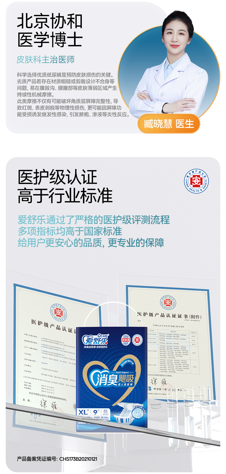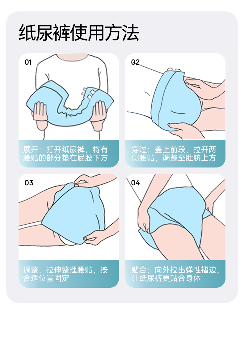 | 产品材质 | 由非织造布和塑料膜复合或缝制而成,非无菌提供,一次性使用 | 使用说明 | 1、使用者侧卧后:展开尿裤并使用腰贴端朝上:调整芯层在腰、臀之间的位置后:打 开另一端 2、协助使用者翻向另一侧:展开尿裤的另一端, 3.让使用者平躺或张开双腿,将有随意贴的尿裤部分拉到腹部位置,使前后两端对正。胶贴尿裤贴合在身体上,然后将两侧弹性隔边拉平,防止漏液外露。 |