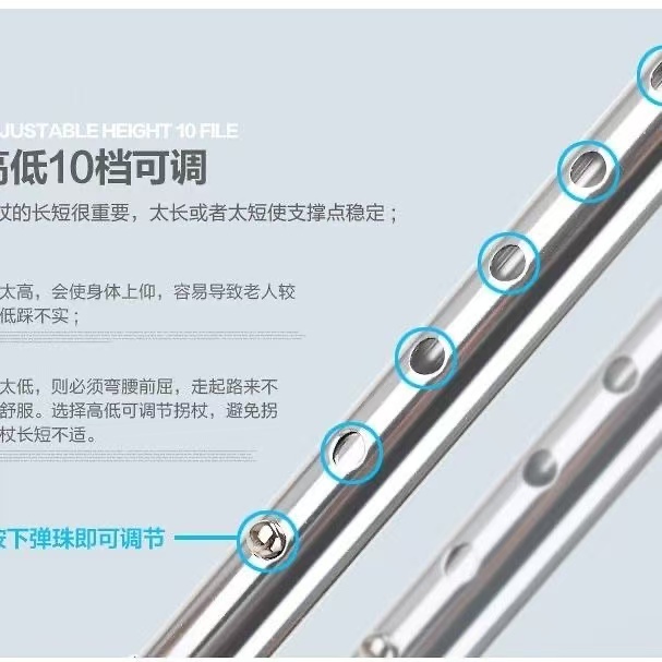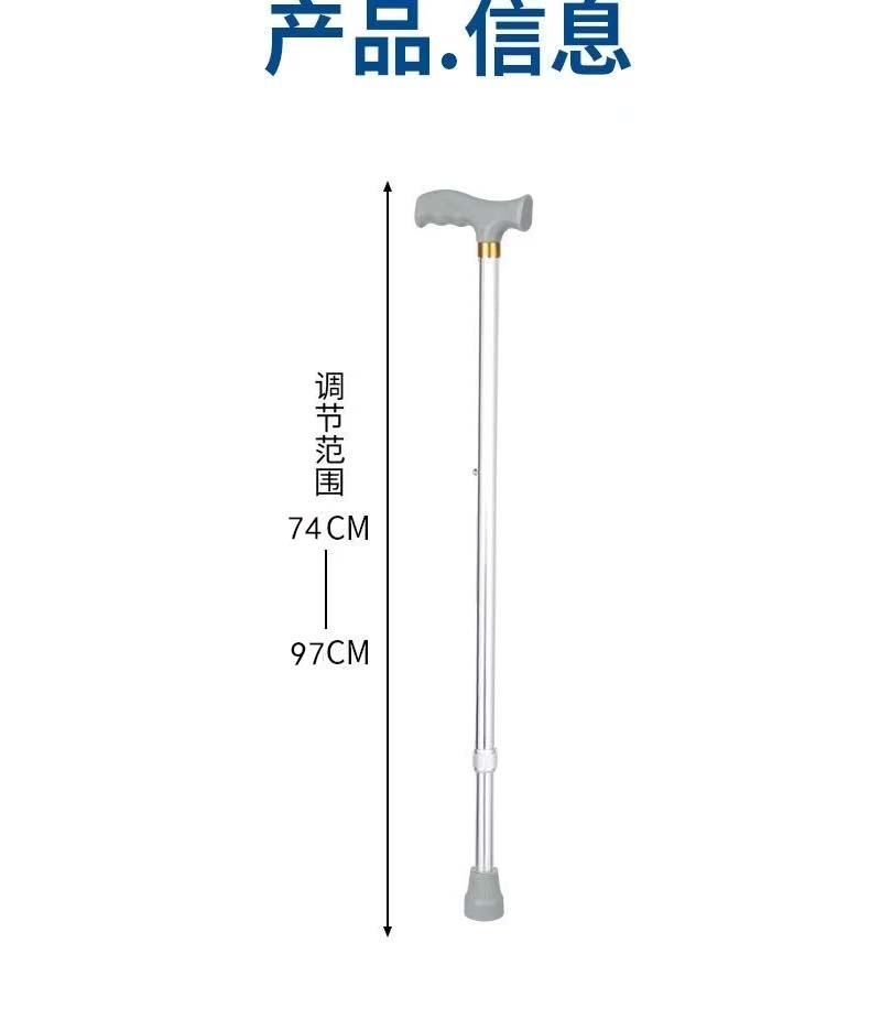 | 送货时效 | 接到订单后3个工作日内发货,具体时效以快递到达时间为准(节假日视情况而定) | 产品参数 | 规格尺寸:740mm-970mm 产品性能:优质铝合金,主体管直径22mm,壁厚1.2mm,腿部管直径19mm,壁厚1.2mm,表面阳极氧化处理,外形美观大方。手柄采用工程聚丙材料,高度可调,10档调节,调节范围是740mm-970mm,徒手轻松调节,伸缩自如,定位安全可靠。脚垫采用有弹性、耐磨、表面摩擦系数较高的防滑橡胶材料。 |