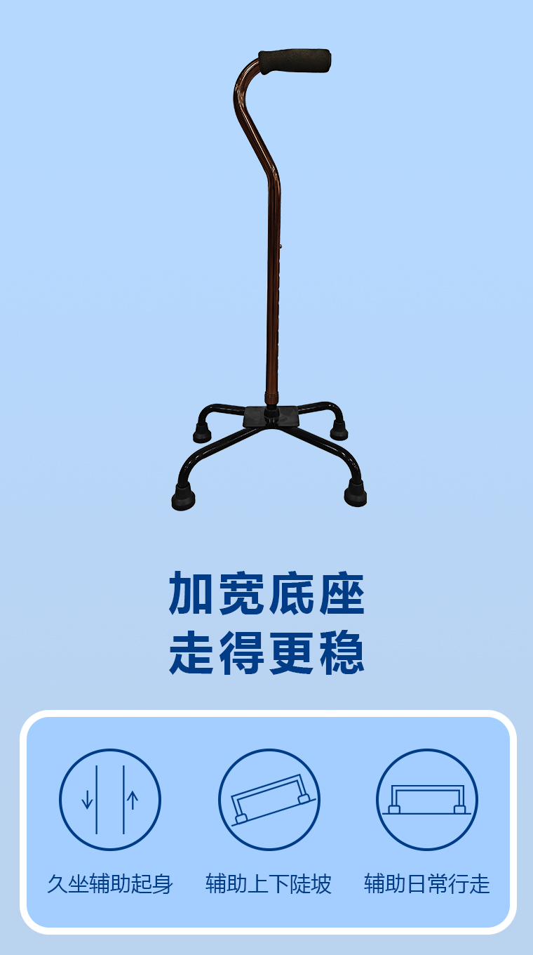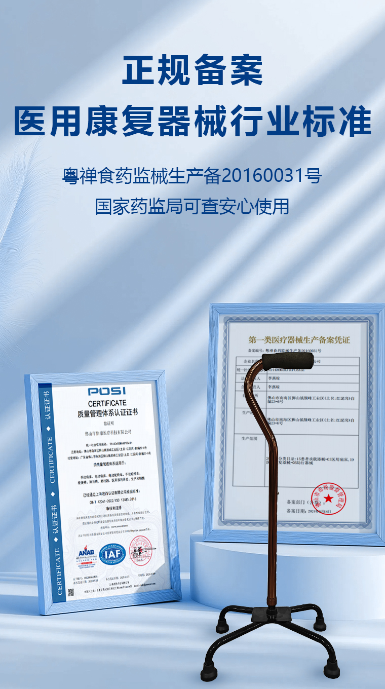 产品符合GB/T 19545.4-2008《单臂操作助行器技术要求和试验方法 第4部分:三脚或多脚手杖》国家标准要求;