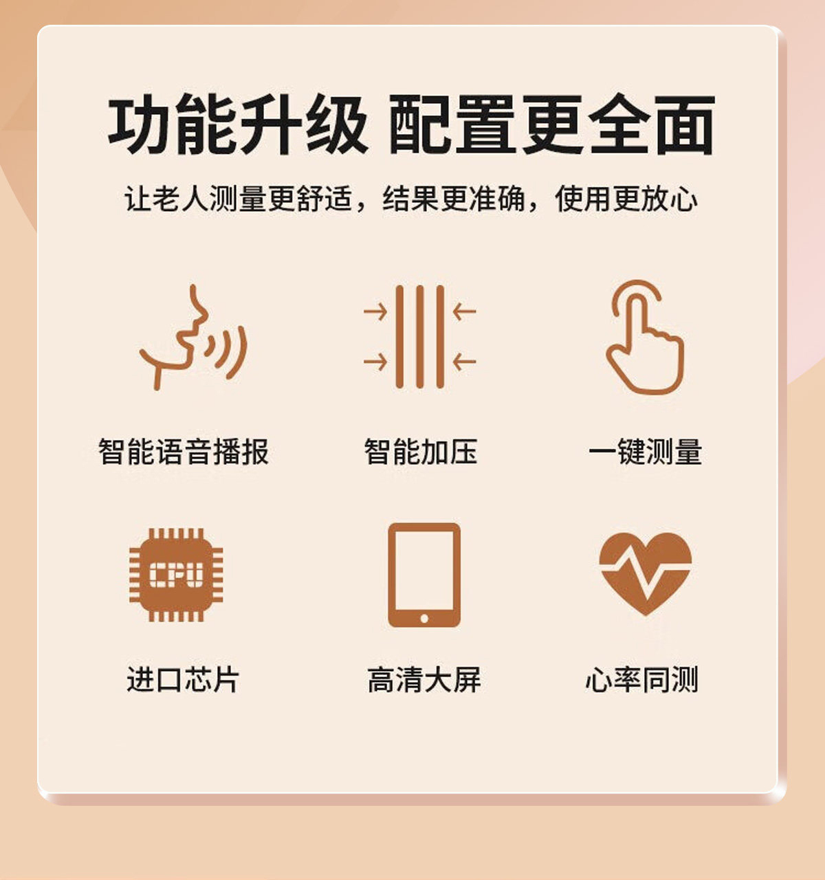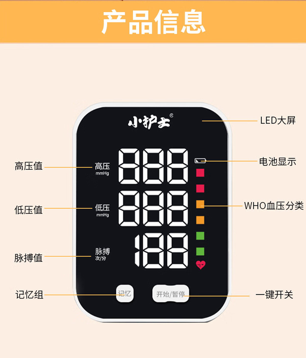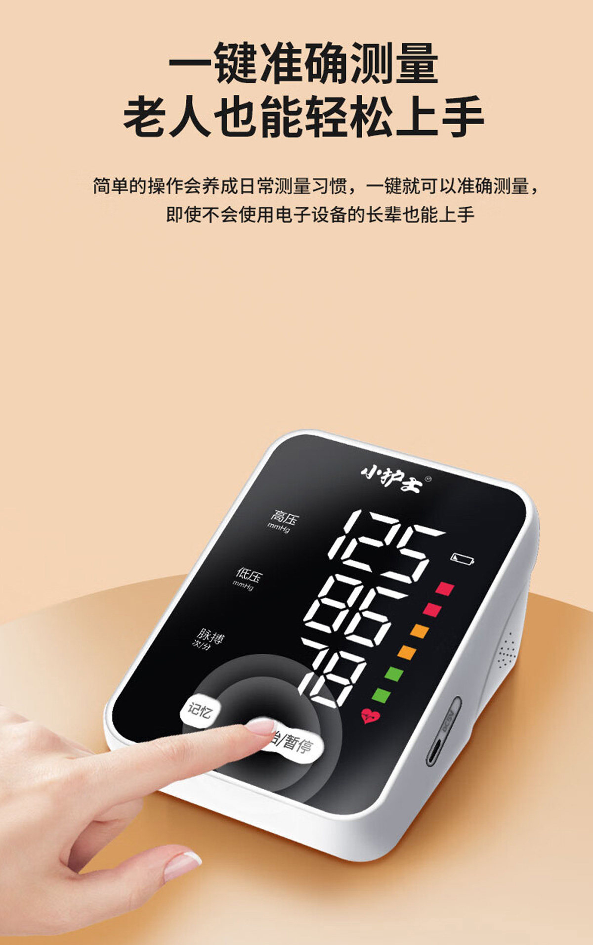 | 产品材质 | 产品由主机、袖带组成;主机由电路板、液晶显示屏、功能按键、外壳、电池组成。 | 使用说明 | 1.正确佩戴袖带,使袖带气嘴指向下手臂,确保袖带的下边缘距离肘关节2~3厘米,袖带可绕上臂旋转在任意位置佩戴。 2.将下手臂平放在桌面上,掌心向上,身体坐直,并使袖带中心与心脏位置处于同一高度。 3.测量者在饭后、运动后、情绪激动等情况下,皆不宜测量。 测量前,按图示静坐5分钟后,再进行测量。 |