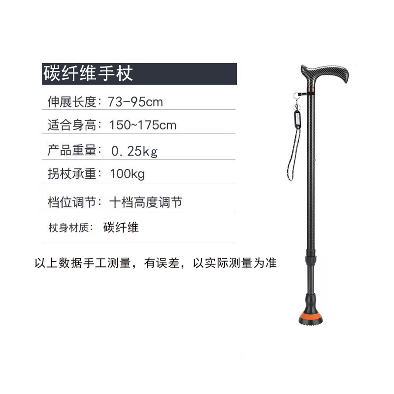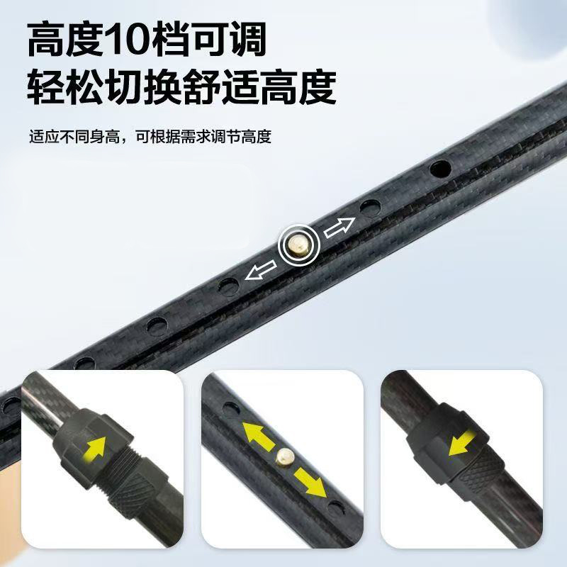 | 送货时效 | 接到订单后3个工作日内发货,具体时效以快递到达时间为准(节假日视情况而定) | 产品参数 | 规格尺寸:73cm-95cm 产品性能:选用优质碳纤维杖身,主体部分管径22mm,PVC水转印手柄,并配有手抓绳,内置膨胀螺丝,外置固定锁扣,双重固定,无意外更安全,脚垫采用轮胎级防滑橡胶脚垫。高度10档可调,调节范围是73cm-95cm,伸缩自如,定位安全可靠。 |