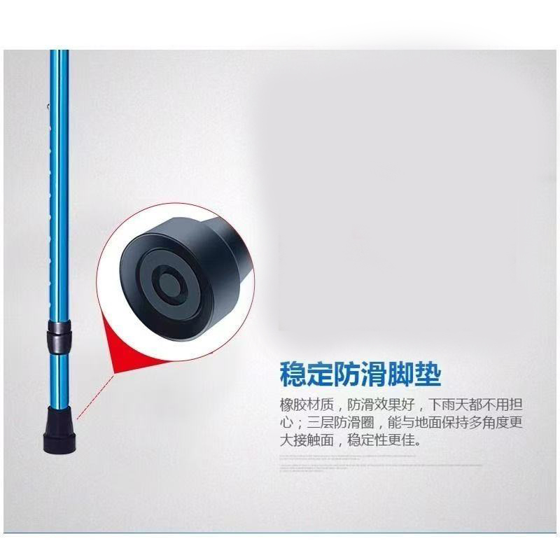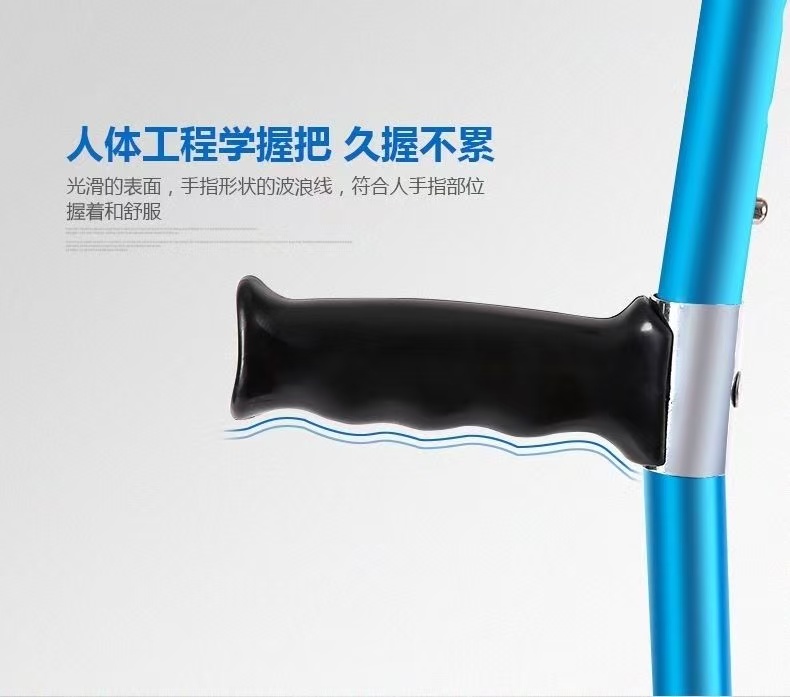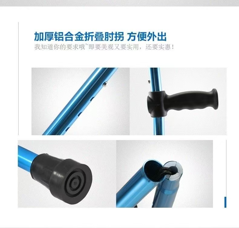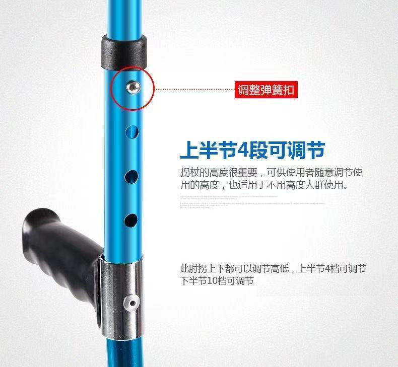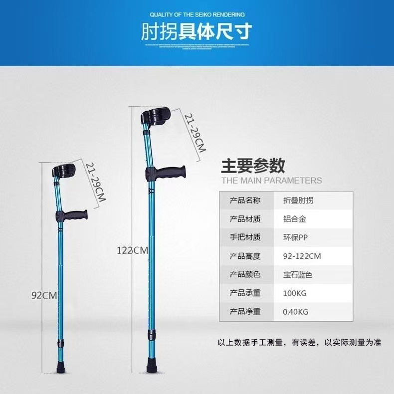 | 送货时效 | 接到订单后3个工作日内发货,具体时效以快递到达时间为准(节假日视情况而定) | 产品参数 | 规格尺寸:92cm-122cm 产品材质:优质铝合金,主体管直径22mm,壁厚1.2mm,腿部管直径19mm,壁厚1.2mm,表面防氧化处理,外形美观大方。高度可调,上肢4档调节,下肢10档调节,调节范围是92cm-122cm,徒手轻松调节,伸缩自如,定位安全可靠。整体可折叠设计,折叠完长度52cm,肘托采用工程聚丙材料一次注塑成型,抗菌抗老化。脚垫采用耐磨、有弹性、表面摩擦系数较高的防滑橡胶材料。 |