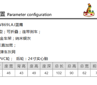 | 送货时效 | 3天 | 产品参数 | 包装尺寸 99*26*74 座宽 46 背高 43 座高 49 座深 42 102 总高 90 总宽 62 前轮 7 后轮 24' 净重 13kg |