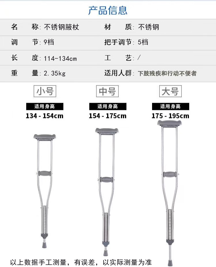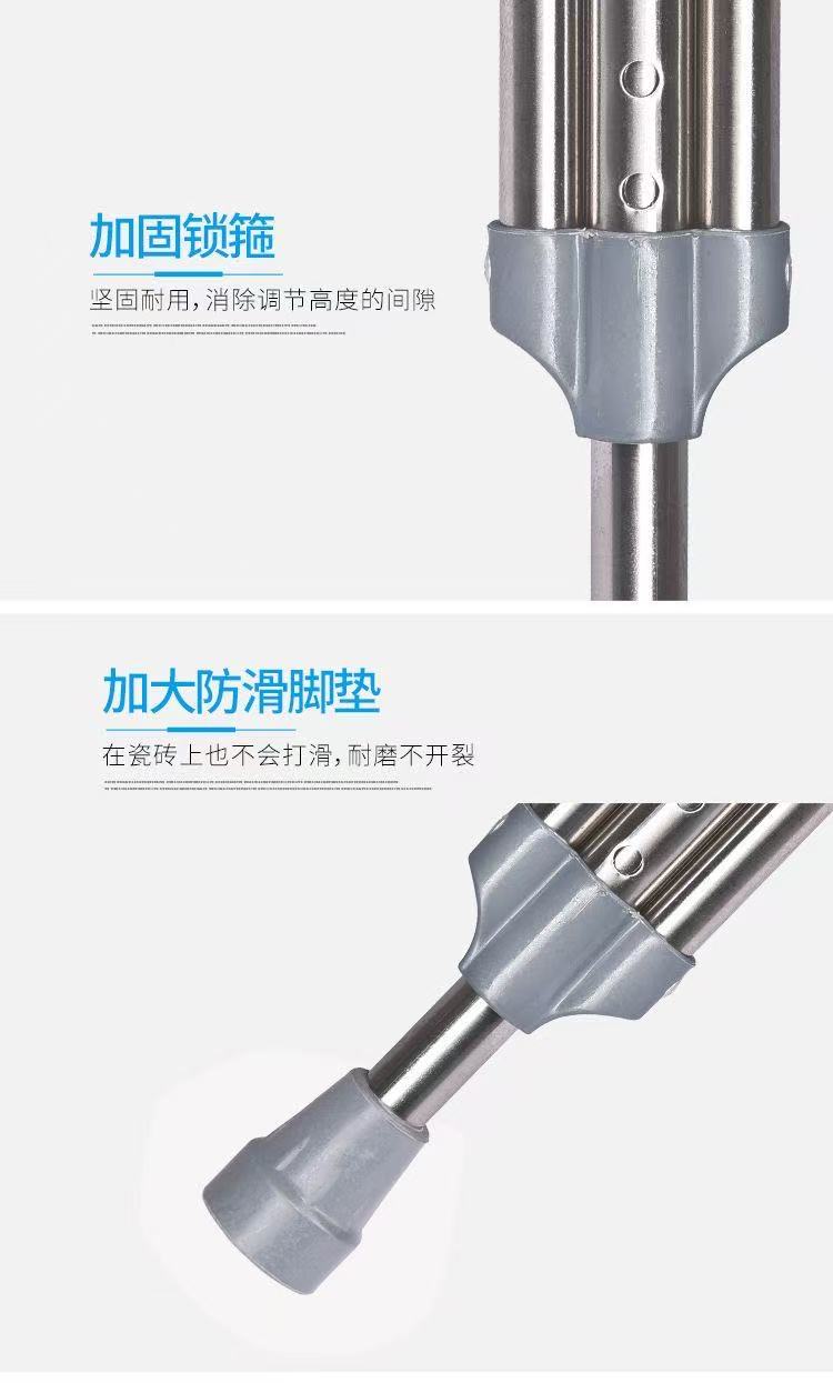 | 送货时效 | 接到订单后3个工作日内发货,具体时效以快递到达时间为准(节假日视情况而定) | 产品参数 | 规格尺寸:114cm-134cm 产品性能:优质不锈钢,主体部分管径19mm,腿部管径22mm,调节管管径25mm,壁厚0.8mm。软托为发泡材质,硬托、手把采用工程聚丙材料一次注塑成型,抗菌抗老化。脚垫:采用有弹性、耐磨、表面摩擦系数较高的防滑橡胶材料; 高度可调节,9档调节,调节范围是114cm-134cm。调节方式:弹珠式调节。(可定制儿童款) |