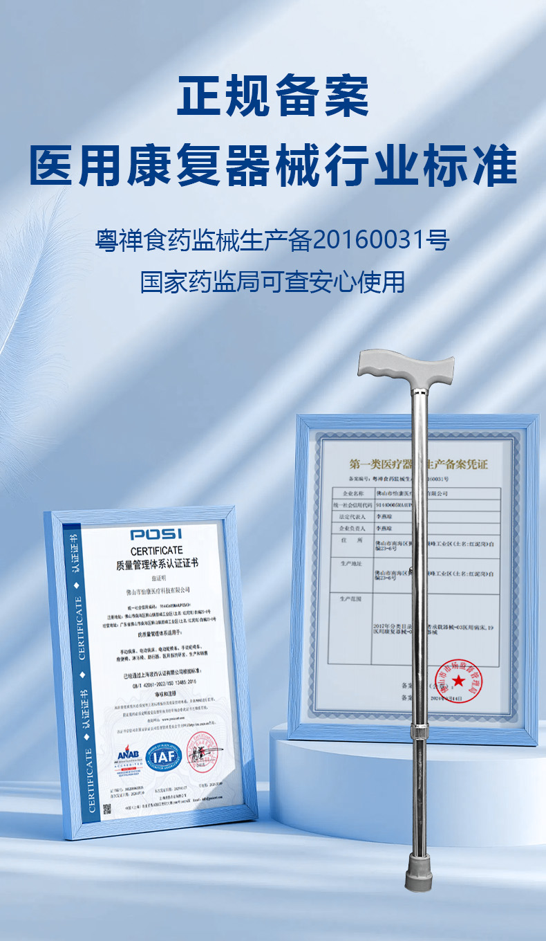 产品符合GB/T 19545.4-2008《单臂操作助行器技术要求和试验方法 第4部分:三脚或多脚手杖》国家标准要求;