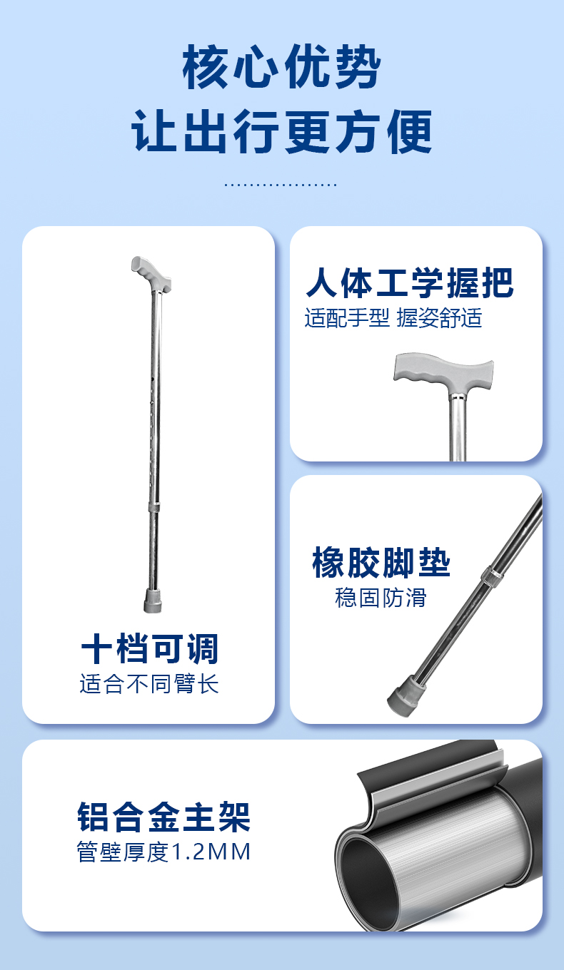 | 送货时效 | 3-20天送货上门 | 产品参数 | 1、10档高度调节,调整范围710MM-940MM,适合155-195CM身高人群 2、铝合金管材坚固耐用,厚度1.2MM 3、承重100KG 4、塑胶手柄(宽度:22MM) 5、净重300克 |