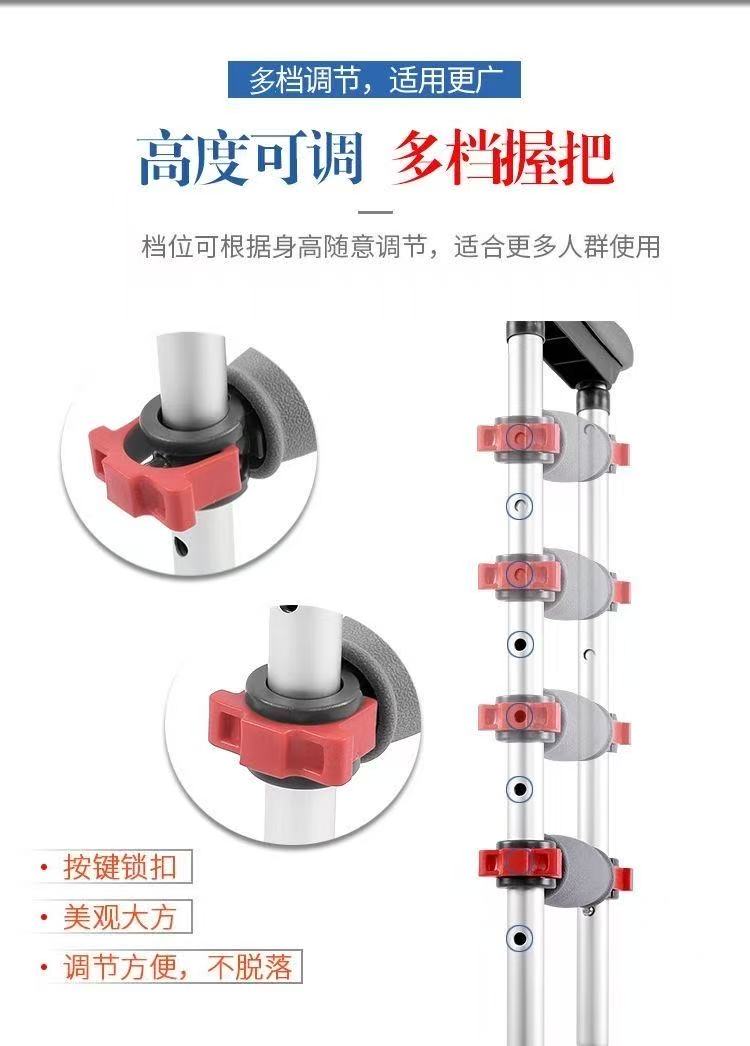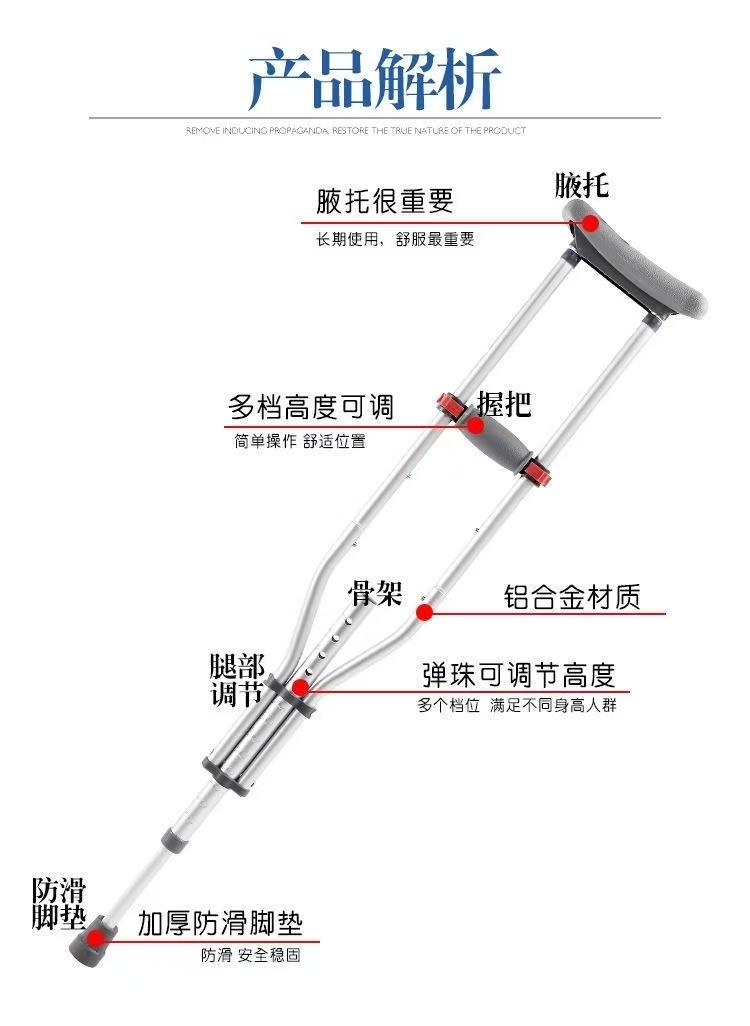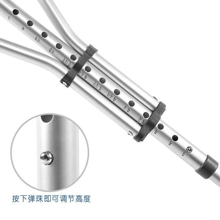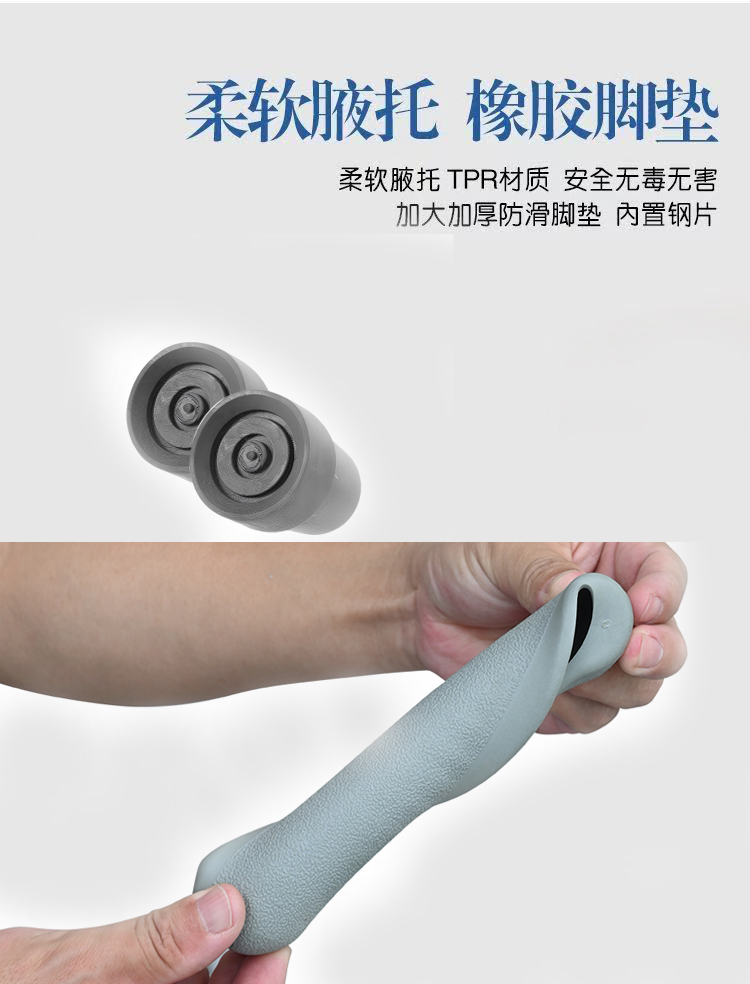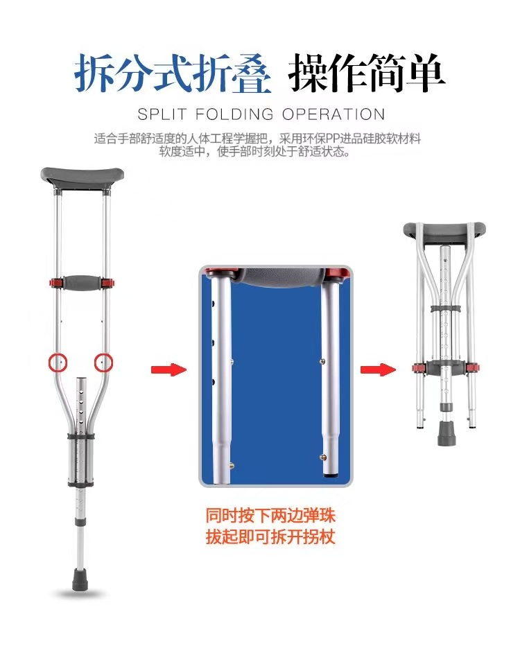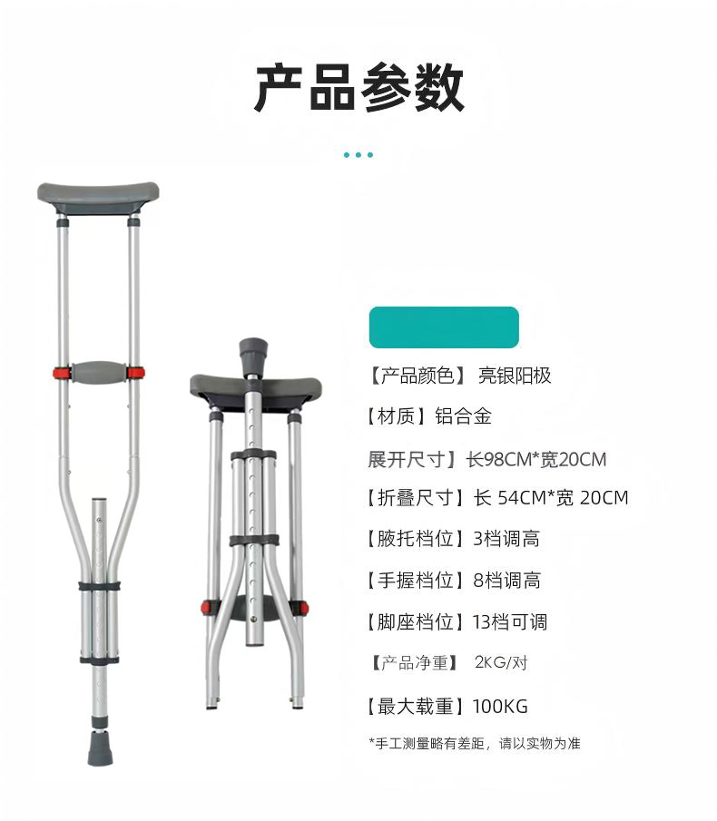 | 送货时效 | 接到订单后3个工作日内发货,具体时效以快递到达时间为准(节假日视情况而定) | 产品参数 | 规格尺寸:98cm-158cm 产品性能:优质铝合金,表面阳极氧化处理,主体部分管径19mm,腿部管径22mm,调节管管径25mm,壁厚1.2mm。软托为TPR材质,硬托、手把采用工程聚丙材料一次注塑成型,抗菌抗老化。脚垫:采用有弹性、耐磨、表面摩擦系数较高的防滑橡胶材料;高度可调节,腋托3档调节,手柄8档调节;脚管13档调节,调节范围是98cm-158cm,调节方式:弹珠式调节。产品可折叠,折叠尺寸:54cm×20cm |