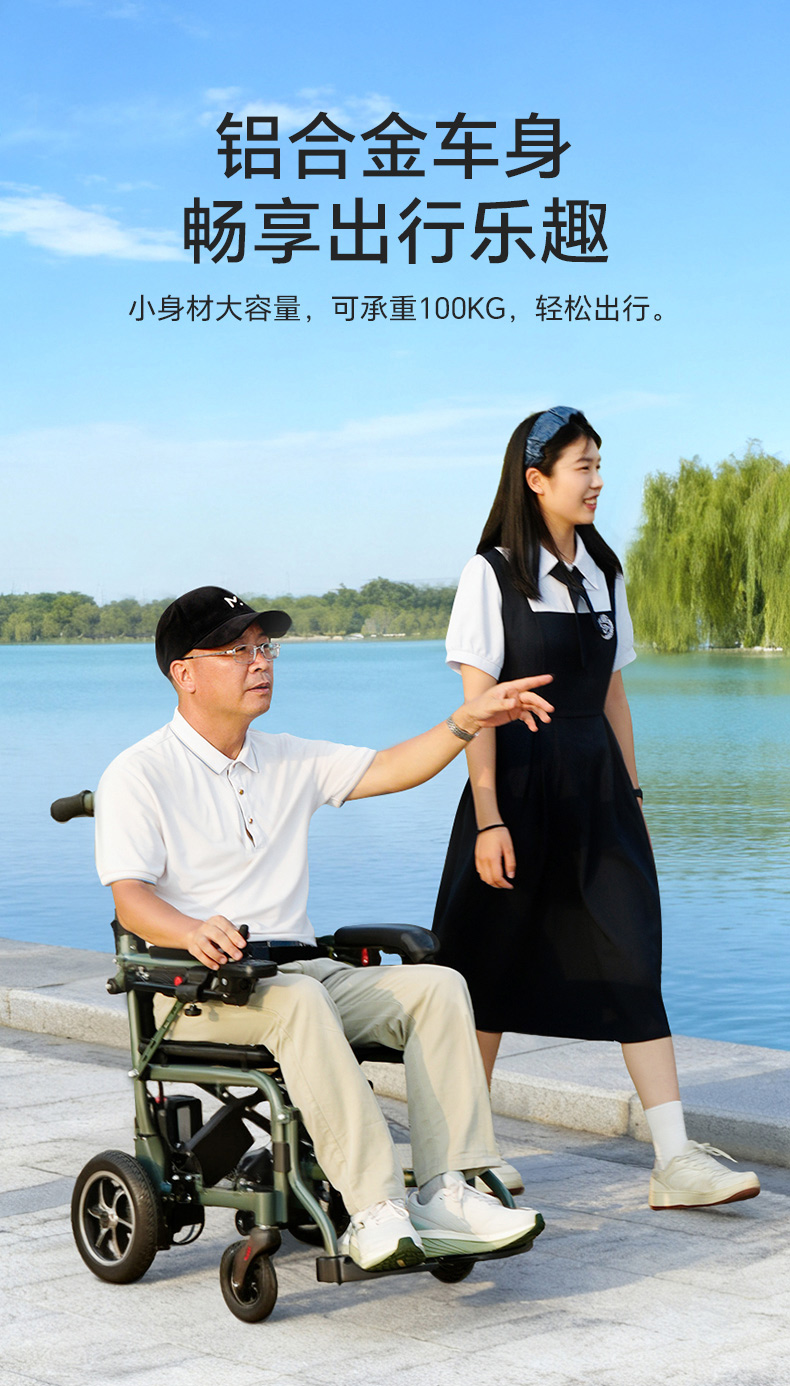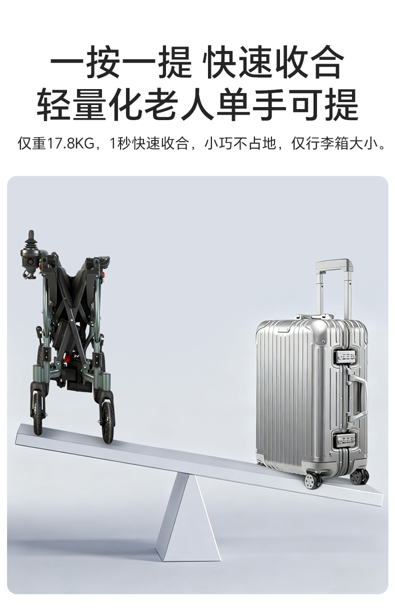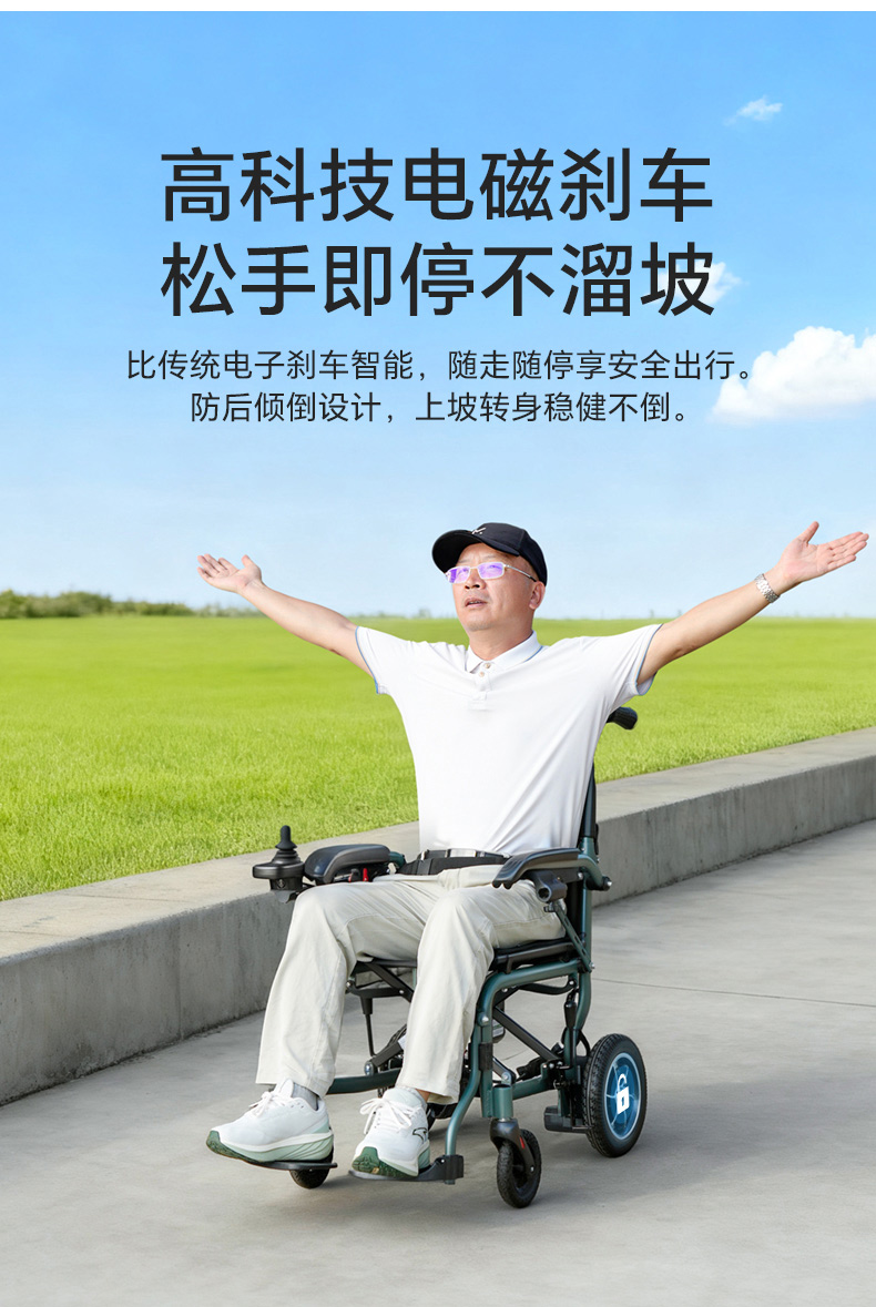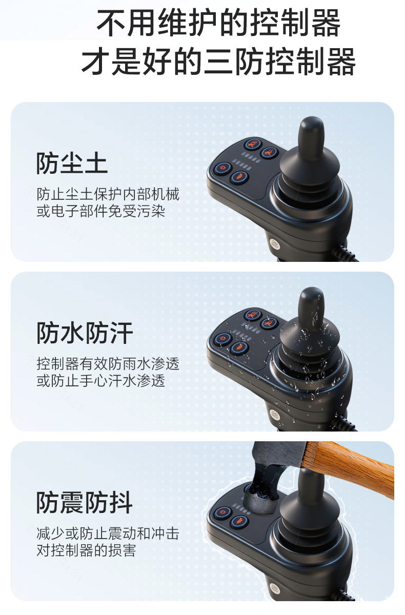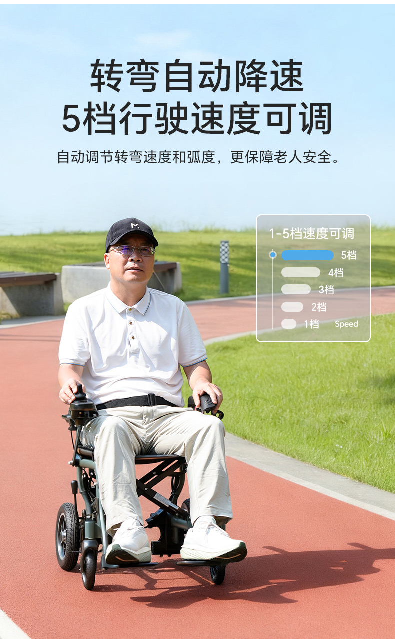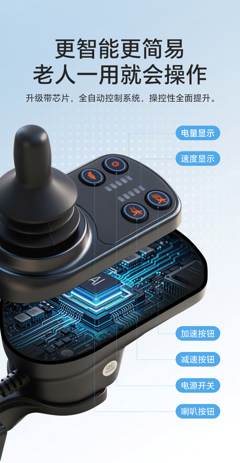 8、智能型一体式控制器,具有控制精准,质量可靠,启、停平稳等优点。并且能左、右扶手互换;控制器时速为:1~6公里/小时可调节,电量与速度显示功能,可任意360度转向,故障报警等功能。适合不同习惯的使用者使用。