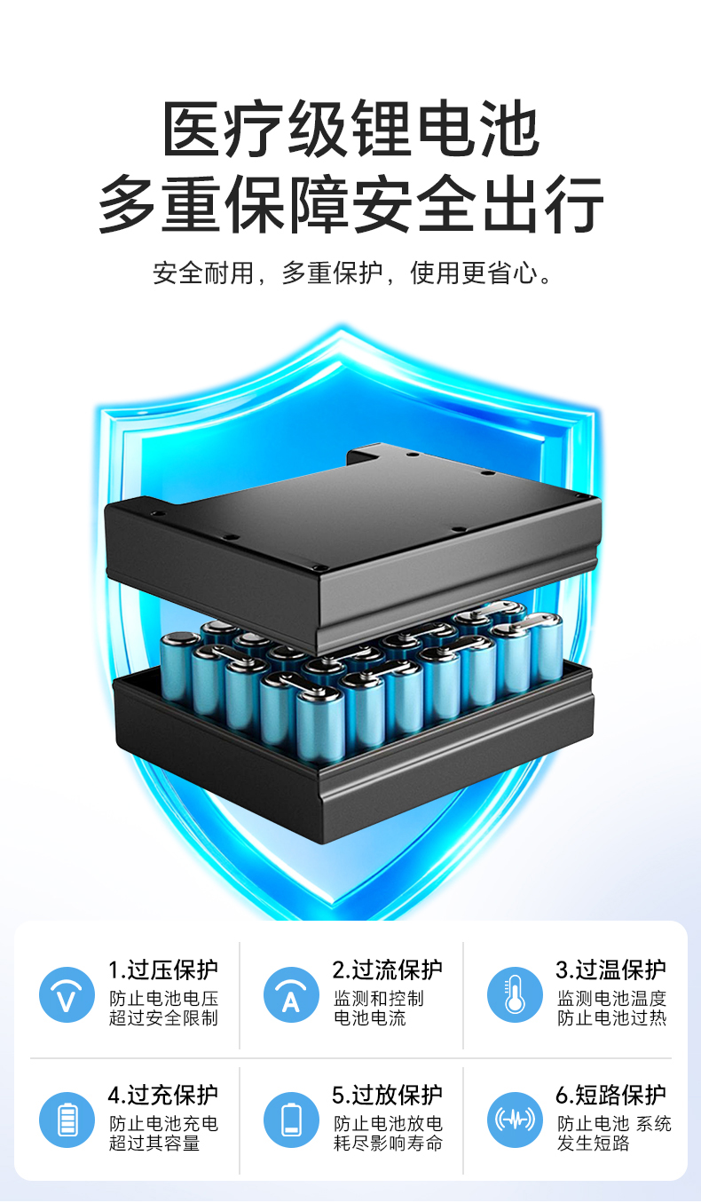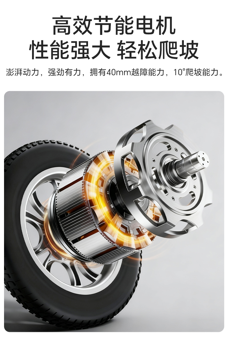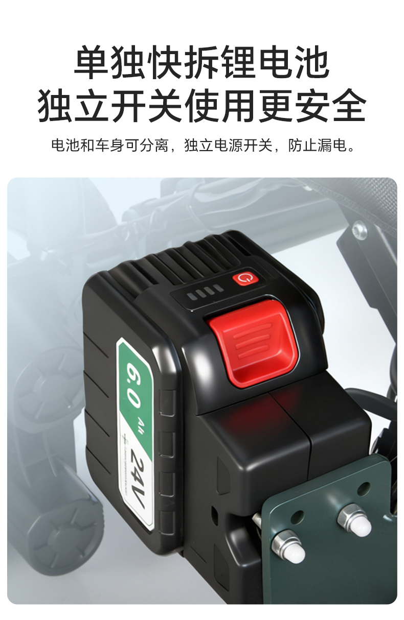 9、电机采用国产180W大功率,低能耗电机。配上24伏6安时锂电池。具有功率大,续航长,爬坡能力强等优点。能轻松爬上坡度:10~12度,具有半坡驻停不溜后等优点。