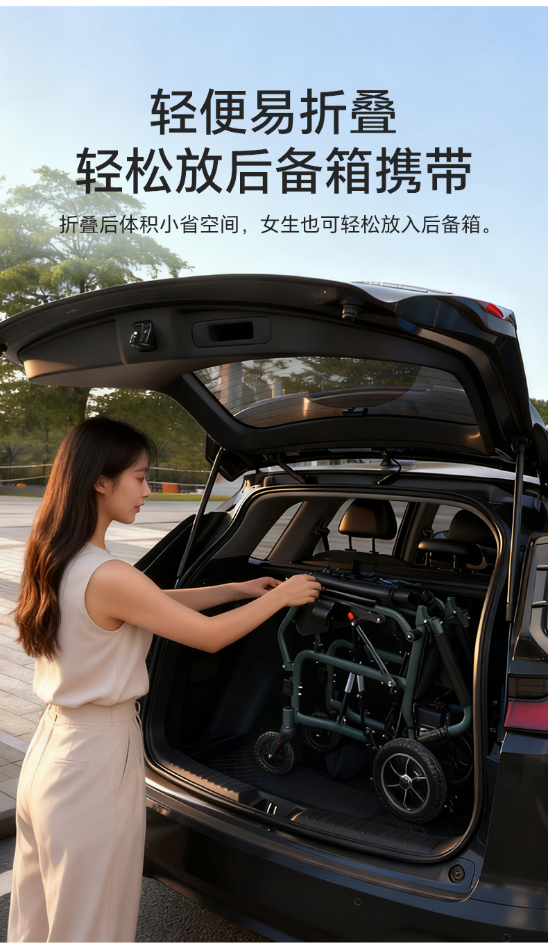 5.简易折叠车架、可折靠背把手管、可上翻拆脚,体积小,重量轻,方便携带出行。