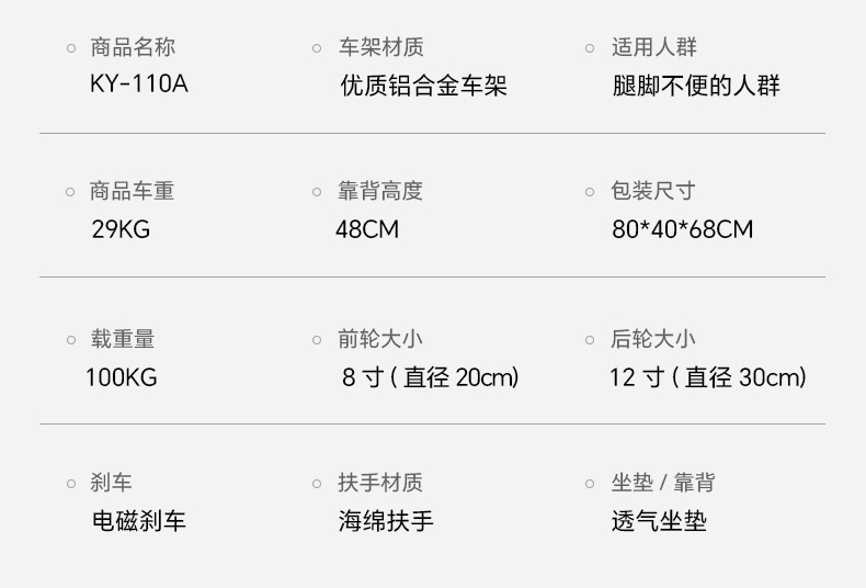 | 送货时效 | 收到订单后7到20个工作日内安排发货;当需求密集遇库存量不足时,双方协商发货日期。 | 产品参数 | 总长:88cm 总宽:60cm 总高:90cm 座位宽度:45cm 座位深度:40cm 座位离地面高度 45cm 靠背高度:45cm 前轮直径:15cm 后轮直径:30cm 车架材质:A3钢 净重量:20kg 承重量:100kg 包装尺寸:78*31*68 |