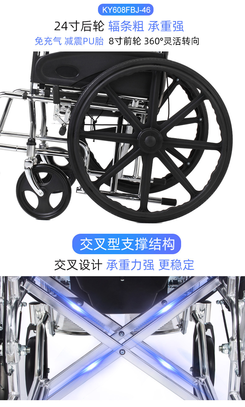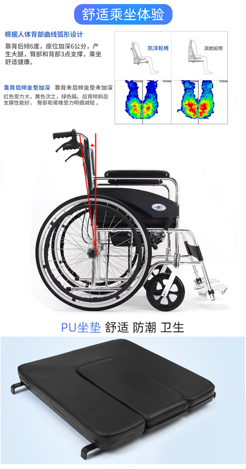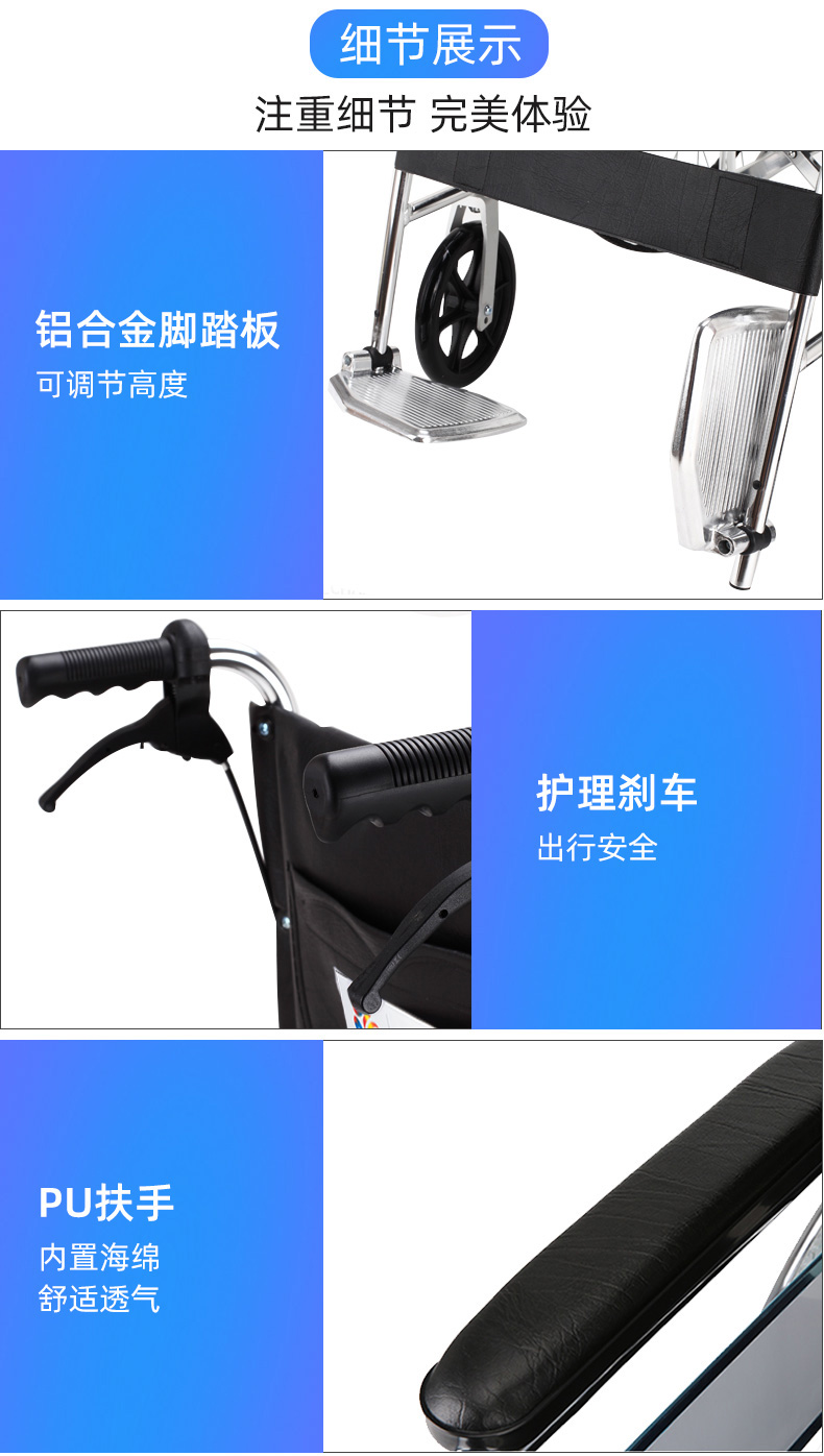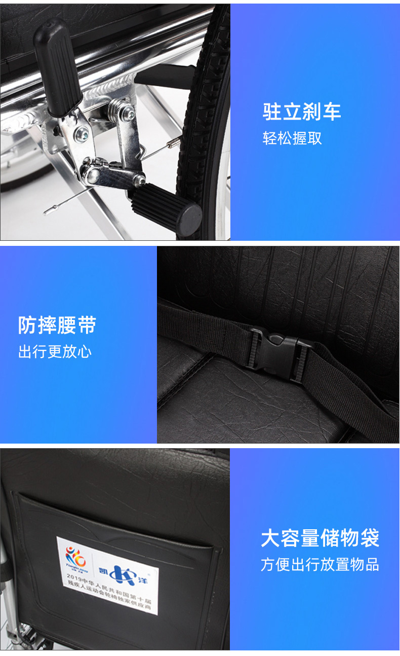 3.刹车结构:采用肘节式刹车装置,刹车装置制动后低于座位面,方便快捷、安全。推把