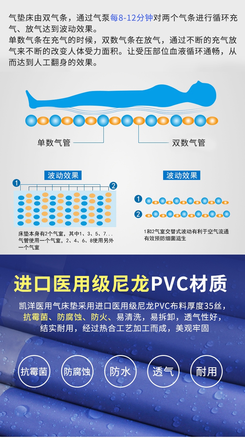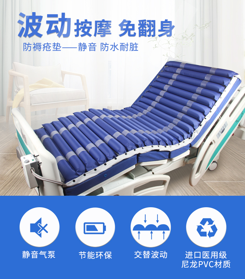 | 送货时效 | 收到订单后7到20个工作日内安排发货;当需求密集遇库存量不足时,双方协商发货日期。 | 产品参数 | 类型:管条床(纯PVC) 材质:台湾进口料PVC 尺寸:190[L]x90[W]x11.5[H]厘米 17气囊 颜色:灰色 配套品: 修补包,连接管、备用管、床罩 压力范围:50mmhg-120mmhg 出气量: 5-7升/分钟 空气循环时间:12 分钟 保险丝: 1A 重量:5.5公斤 承载重量:145公斤 功率:220V /50Hz |
