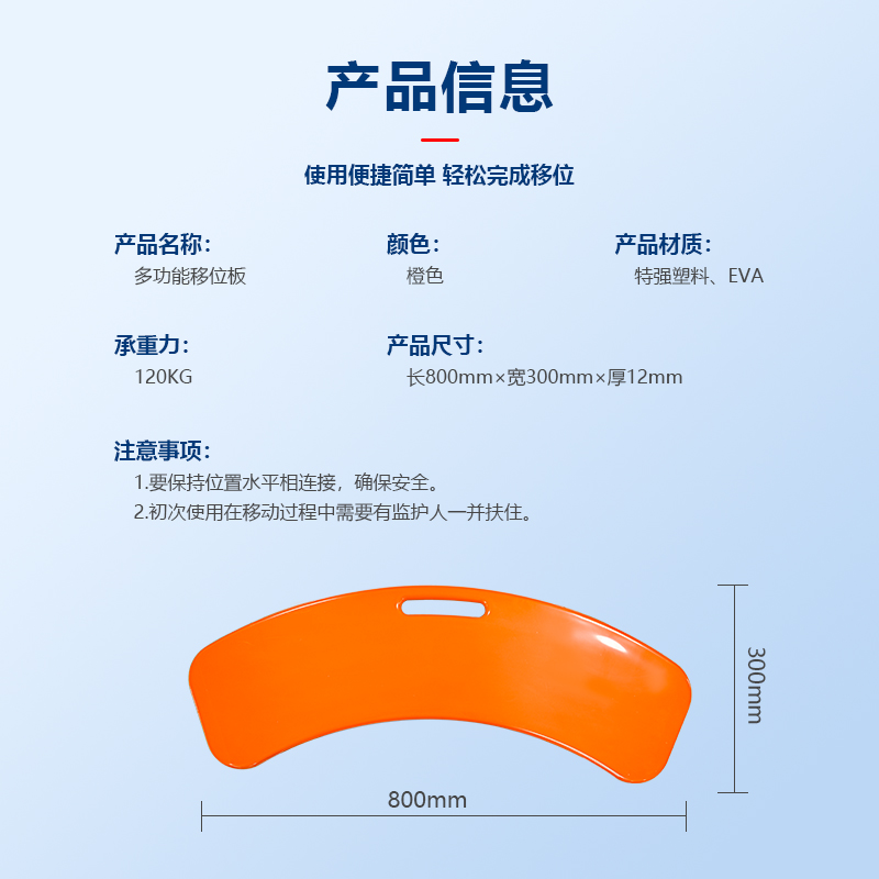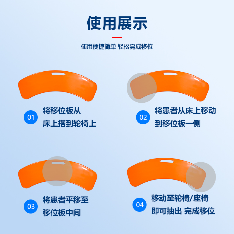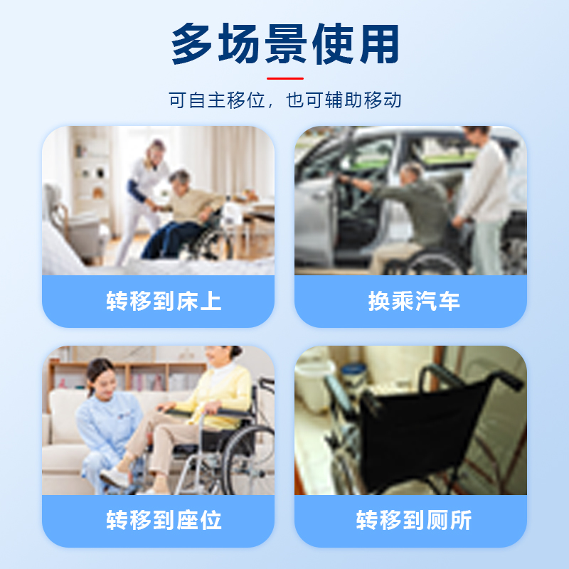 4、产品说明:帮助行动不便的人在床、轮椅、担架等不同器具之间转移,提供平坦稳定的表面,让转移更安全顺畅,例如从床上转移到轮椅上,或从轮椅转移到汽车等。