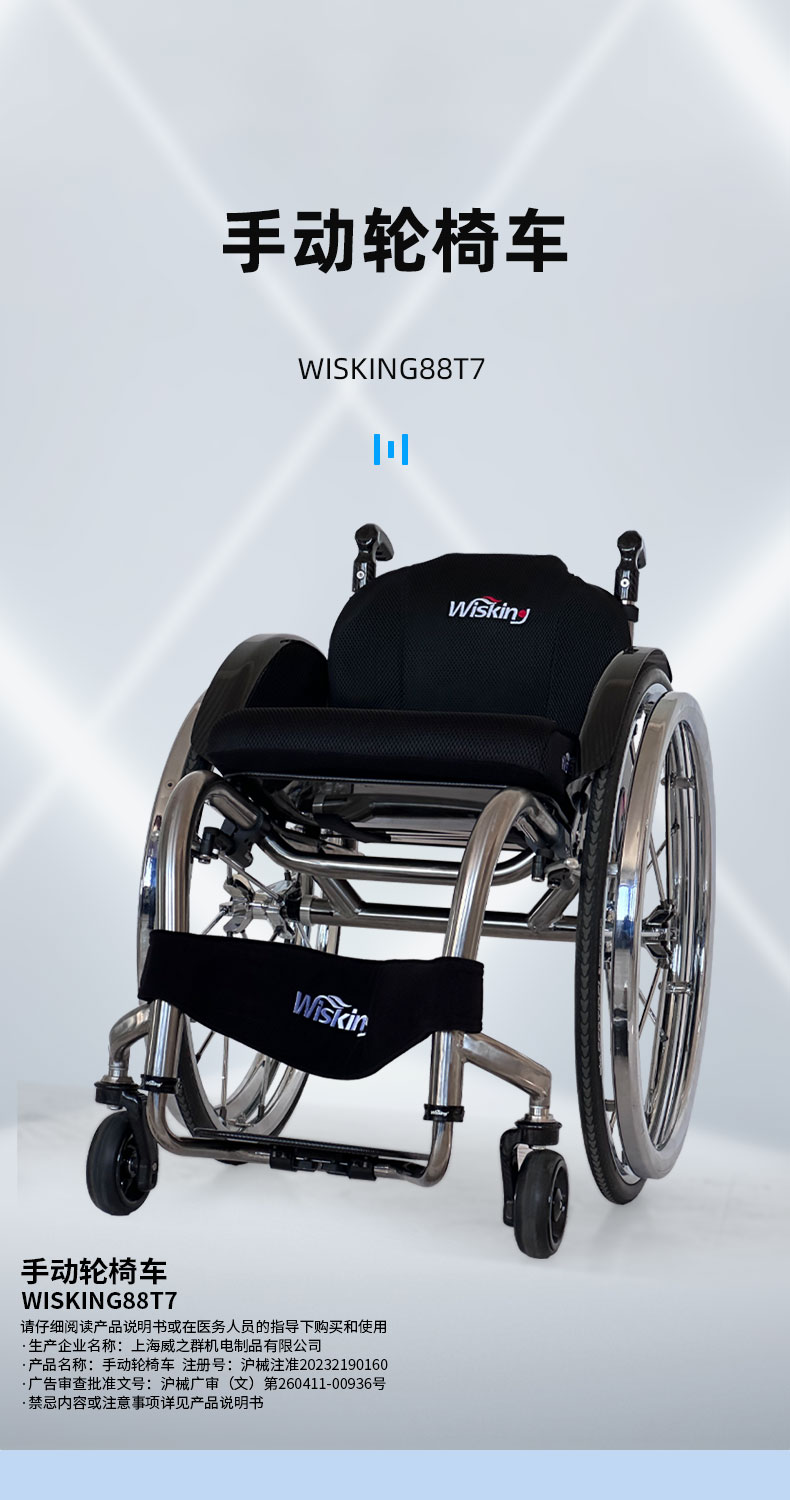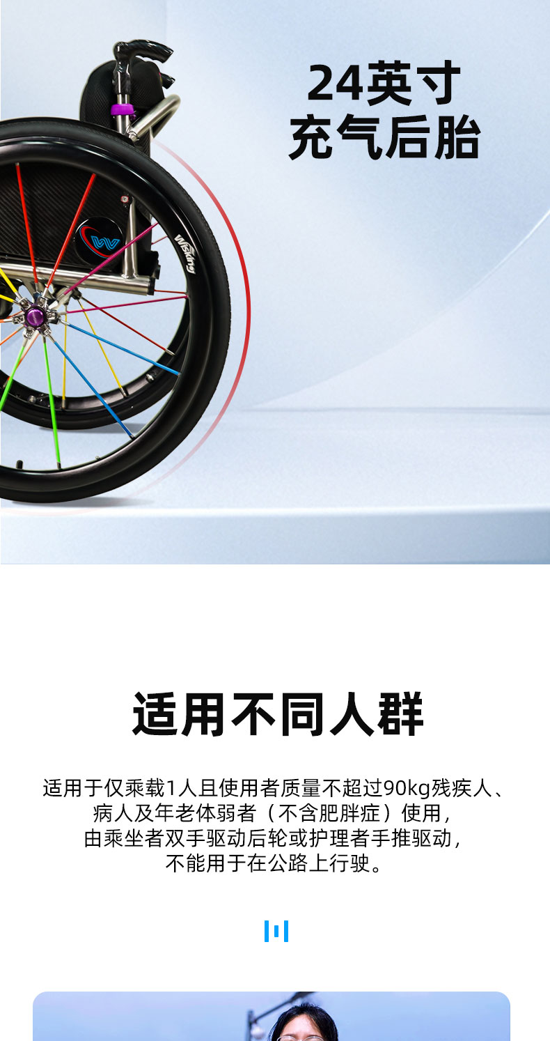 | 产品材质 | 钛合金一体车架,碳纤维边板,整车重量为13公斤,非常轻巧。后轮可快拆。 | 使用说明 | 威之群运动式生活轮椅是根据脊髓损伤者的受伤位置、身高、体重,坐宽、坐深、小腿长度来量身定制的轮椅,非常人性化、个性化的解决了不同伤友对轮椅的不同需求问题。 |