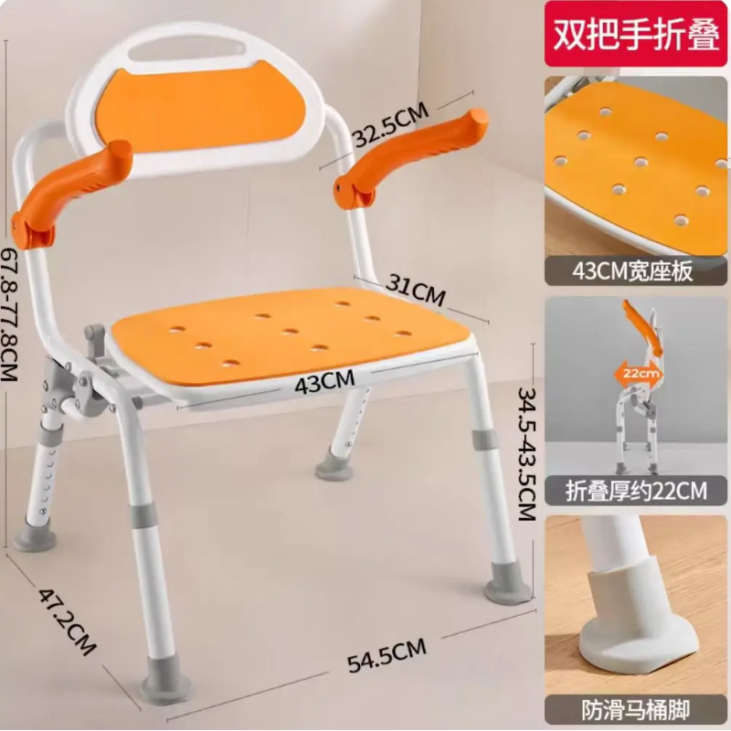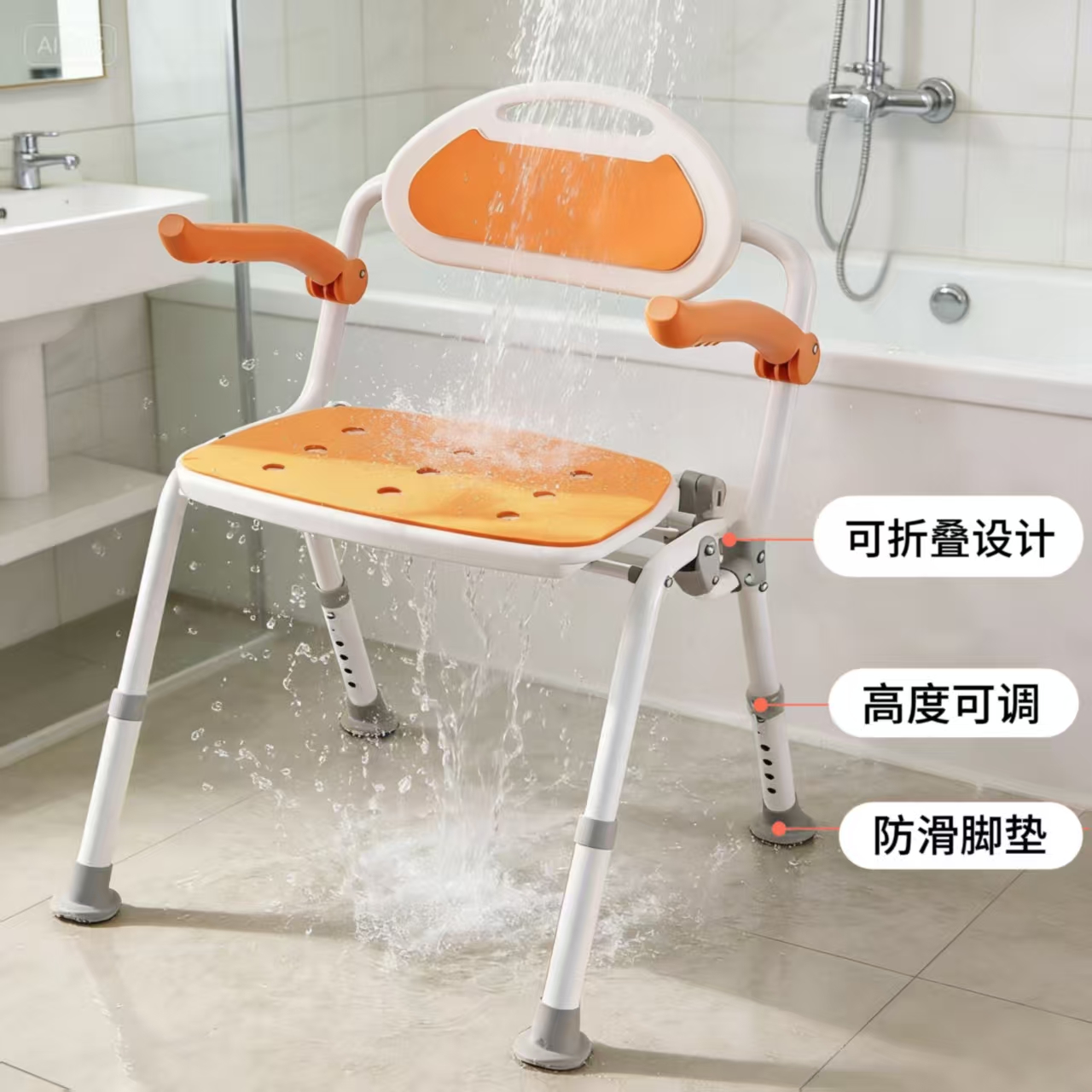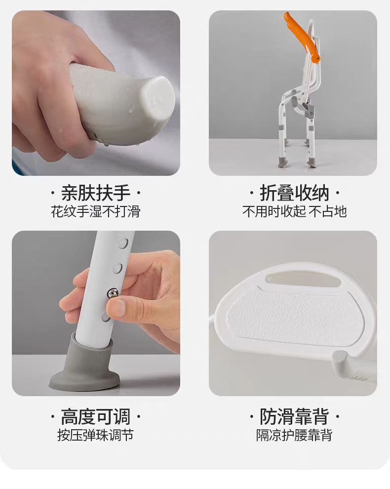| 产品材质 | 材质:椅架高强度铝合金, 座板和靠背材质为高密度PE,扶手材质为加强尼龙。 | 使用说明 | 1、将洗浴椅平稳放置在浴室地面,确保四脚着地且地面平整。 2、根据使用者身高,调节座高至合适位置。 3、帮助使用者缓慢坐上椅子,双手扶住扶手保持平衡。 注意事项 仅限坐着使用,严禁踩踏或站立在椅子上。 避免在不平整或倾斜地面使用,防止滑倒。 若椅子出现松动、变形或部件损坏,立即停止使用并联系售后。 |
