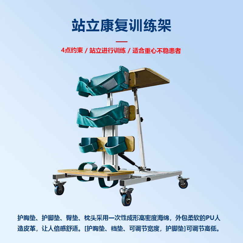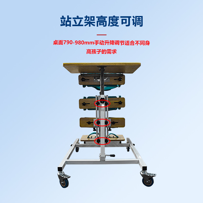 2、站立架按人体站姿设计,固定架上有调节旋钮,可调节适用高度,为人体提供最佳用餐支撑。