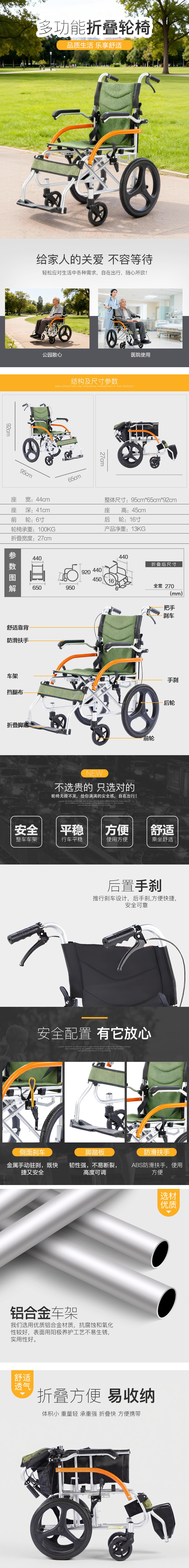 | 产品材质 | 生产厂家:天津市长静康复器具有限公司 名称 参数 总长 950mm 总宽 650mm 总高 920mm 折叠宽度 270mm 靠背高度 440mm 座位深度 410mm 座位宽度 440mm 座位离地面高度 450mm 前轮 6寸 后轮 16寸 基本载荷 100kg 净重量 13kg 性能及结构特点: 此款是以GB/T13800-2009《手动轮椅车》国家标准作为设计生产的执行标准,其结构特点如下: 车架: 选用符合国标的高强度6063铝合金材质制成,管直径19mm、22mm,壁厚2.0mm,表面采用氧化处理,靠背和整车可折叠,便于携带和收纳; 前轮: 6寸轮配高品质PU实心橡胶轮胎,高强度塑料前轮叉,美观耐用; 后轮: 16寸PU注塑一体轮,美观,适应多种路况; 刹车: 金属手动驻刹,并配有护理型刹车,能让看护着随时刹车,既快捷又安全; 座靠垫: 软座垫,靠背可折叠,折叠后体积小巧,便于携带和收纳,座垫600D加厚防阻燃牛津尼龙布配网格布制成,使用透气,缝边牢固整齐,无褶皱、跳线和破损等缺陷;车身带有固定安全带和护腿带,贴心设计,可固定使用者,防止使用者在使用过程中的隐患发生;靠背后面配置储物袋设计,可随身携带一些随身物品; 扶手: 扶手可上翻,配置聚氨酯扶手垫;舒适易清洁; 脚托: 上翻式腿部支架可与车架调节角度,且脚踏板高度可调,踏板采用加厚塑料踏板;配有安全带;可根据使用者需要配置加强防护装置; | 使用说明 | 详见说明书 |
