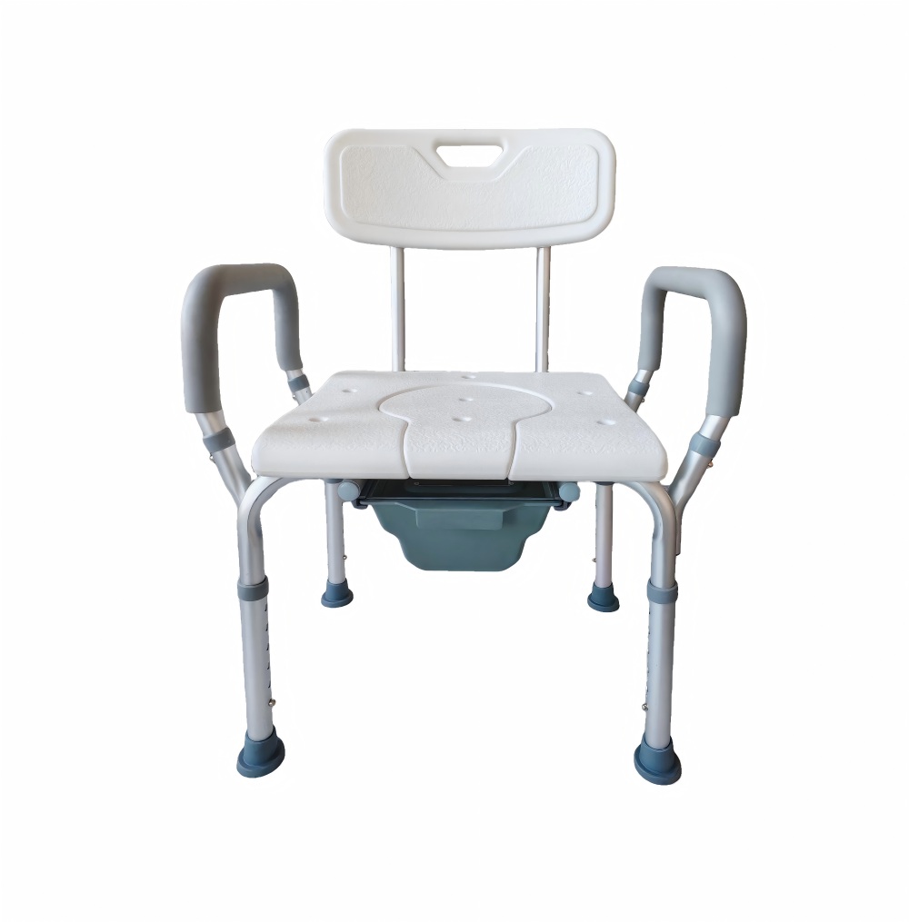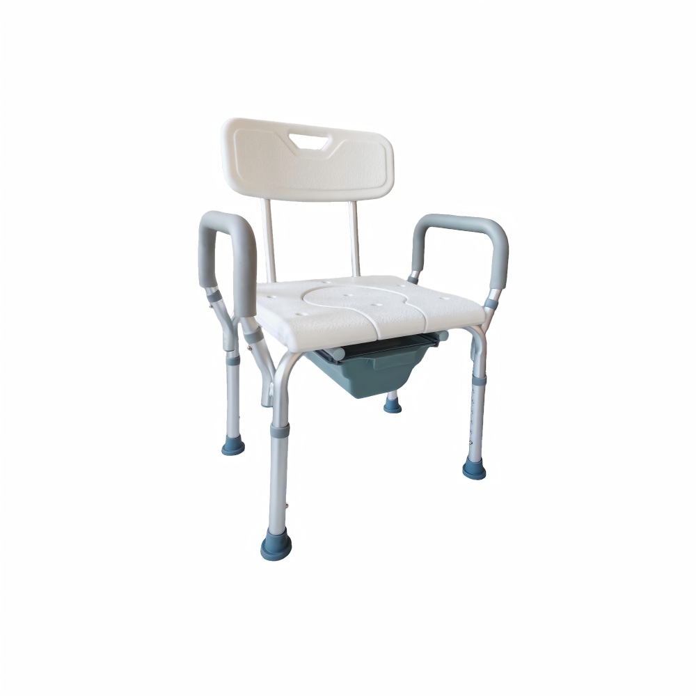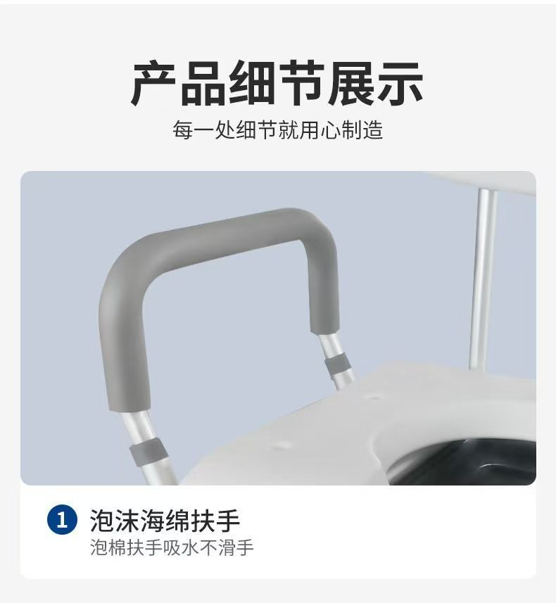 | 送货时效 | 接到订单后3个工作日内发货,具体时效以快递到达时间为准(节假日视情况而定) | 产品参数 | 产品性能:优质铝合金,大架管直径25mm,壁厚1.2mm。腿管直径28mm,壁厚1.2mm,高度可调,6档调节,简易组装。靠背与座板采用聚丙乙烯材质,一次性吹塑成型,表面美观,无毛刺,光滑平整,靠背可拆卸。配有可自由拆卸扶手,脚垫材质为耐磨、表面摩擦系数较高的防滑橡胶材质。产品配有大容量便桶,可实现洗浴座便两用。 |